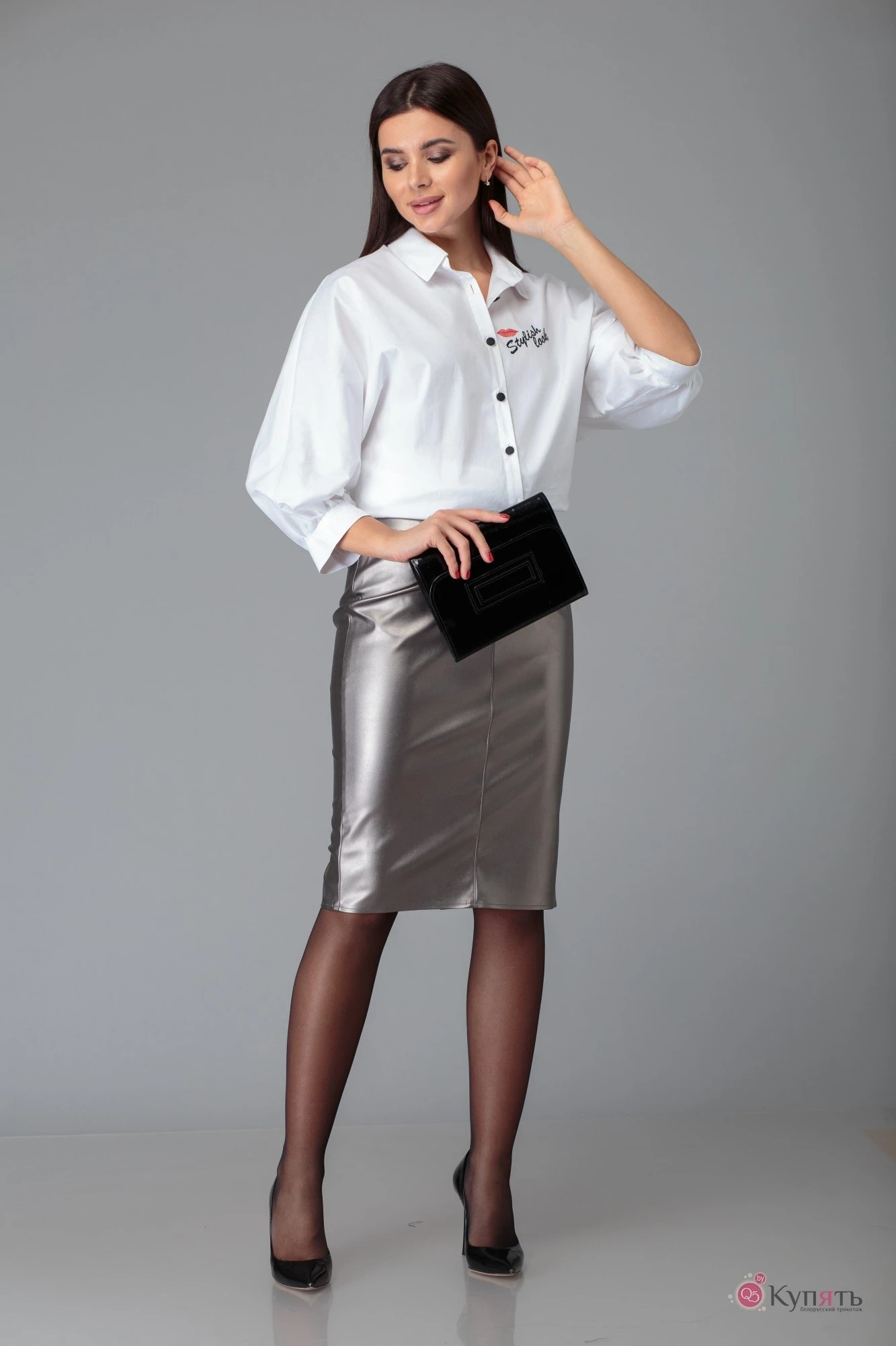 Стильный юбочный комплект, состоящий из блузы и юбки. Блуза прямого силуэта , по боковым швам – разрезы. Длина по спинке- 73 см. По переду полочки - планки. Застёжка на петли-пуговицы. Воротник рубашечного типа со стойкой. Рукав – втачной, одношовный, со сборкой по окату и низу, с притачной манжетой, высотой 8.5 см , на функциональную застёжку петли – пуговицы. Длина рукава – 63 см. Декор блузы – вышивка по переду и спинке. Юбка прилегающего силуэта из «эко-кожи», зауженная к низу, по среднему шву – потайная застёжка-молния, в низу – разрез. Верхний край юбки обработан обтачкой. Длина юбки по боковому шву – 64 см. Юбка на подкладке.