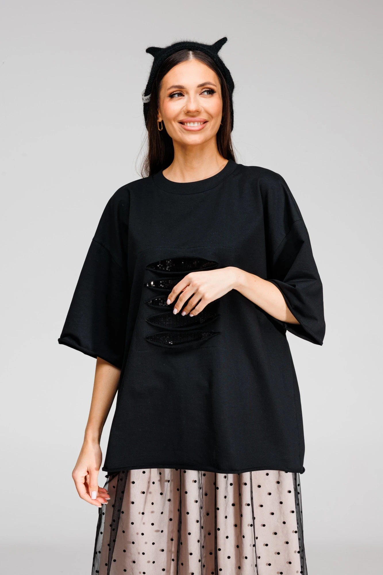 Майка свободного силуэта, со спущенной проймой и укороченным втачным рукавом, длиной 26 см. По центру майки расположен декоративный элемент квадратной формы: с изнаночной стороны настрочен квадрат из полотна с пайетками. С лицевой стороны созданы пять горизонтальных прорезей, через которые видна деталь из пайеток. Размер детали 23х23 см. Горловина округлая, оформлена планкой 2,8 см. Длина майки по спинке 62-65см (в зависимости от размерного ряда).