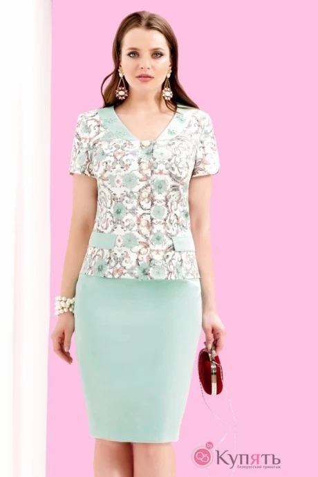 Комплектация: жакет, юбка Современный женский костюм полуприлегающего силуэта. Жакет с фигурным вырезом горловины и центральной застёжкой на петли и пуговицы. По переду отрезная деталь у горловины из однотонной ткани с декором и клапаны в нижней части. Спинка со средним швом и двумя рельефами. Рукава втачные короткие с фигурным низом. Юбка средней посадки на притачном поясе. Заднее полотнище со средним швом, потайной молнией и шлицей в среднем шве. Юбка на подкладке. Жакет длиной по спинке –55.5 см, ширина жакета на уровне глубины проймы: 48р – 103см, 50р – 107см,52р – 111см, ширина жакета по линии бёдер: 48р – 109см, 50р – 113см, 52р – 117см. Длина рукава -19 см. Длина юбки вдоль середины переднего полотнища – 60см. Ширина юбки по линии талии: 48р –81см, 50р –85см,52р – 89см, ширина юбки по линии бёдер: 48р –104.6см, 50р –108.6см,52р –112.6см.