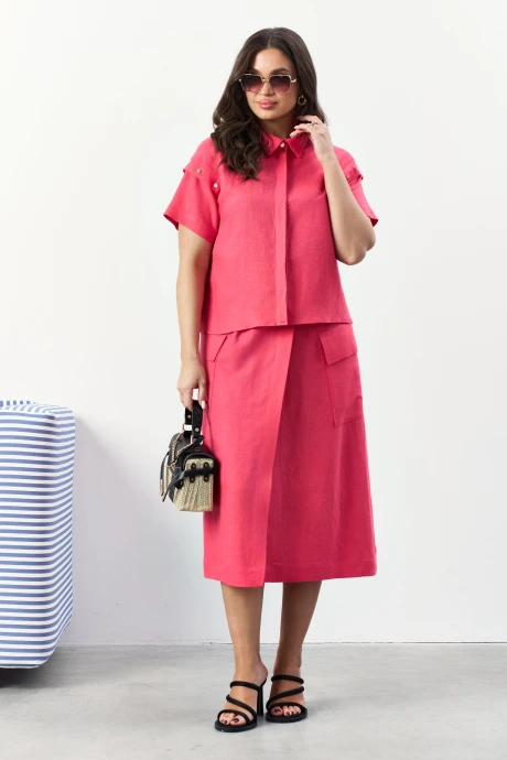 Юбка на притачном поясе и со съёмным поясом из основной ткани по талии. Изделие с застёжкой на кнопки и потайные пуговицы по переду в верхней части. Переднее полотнище с накладными карманами с клапанами. Заднее полотнище с кокеткой и средним швом.