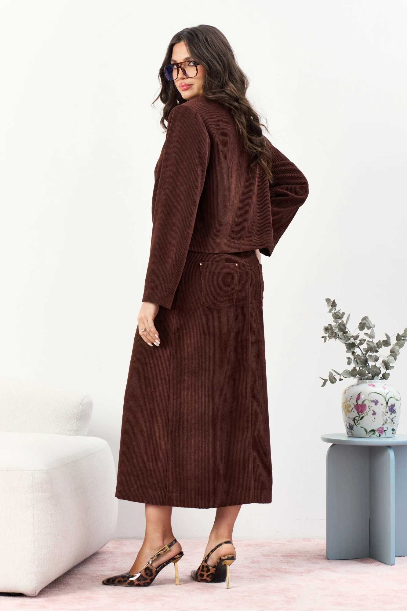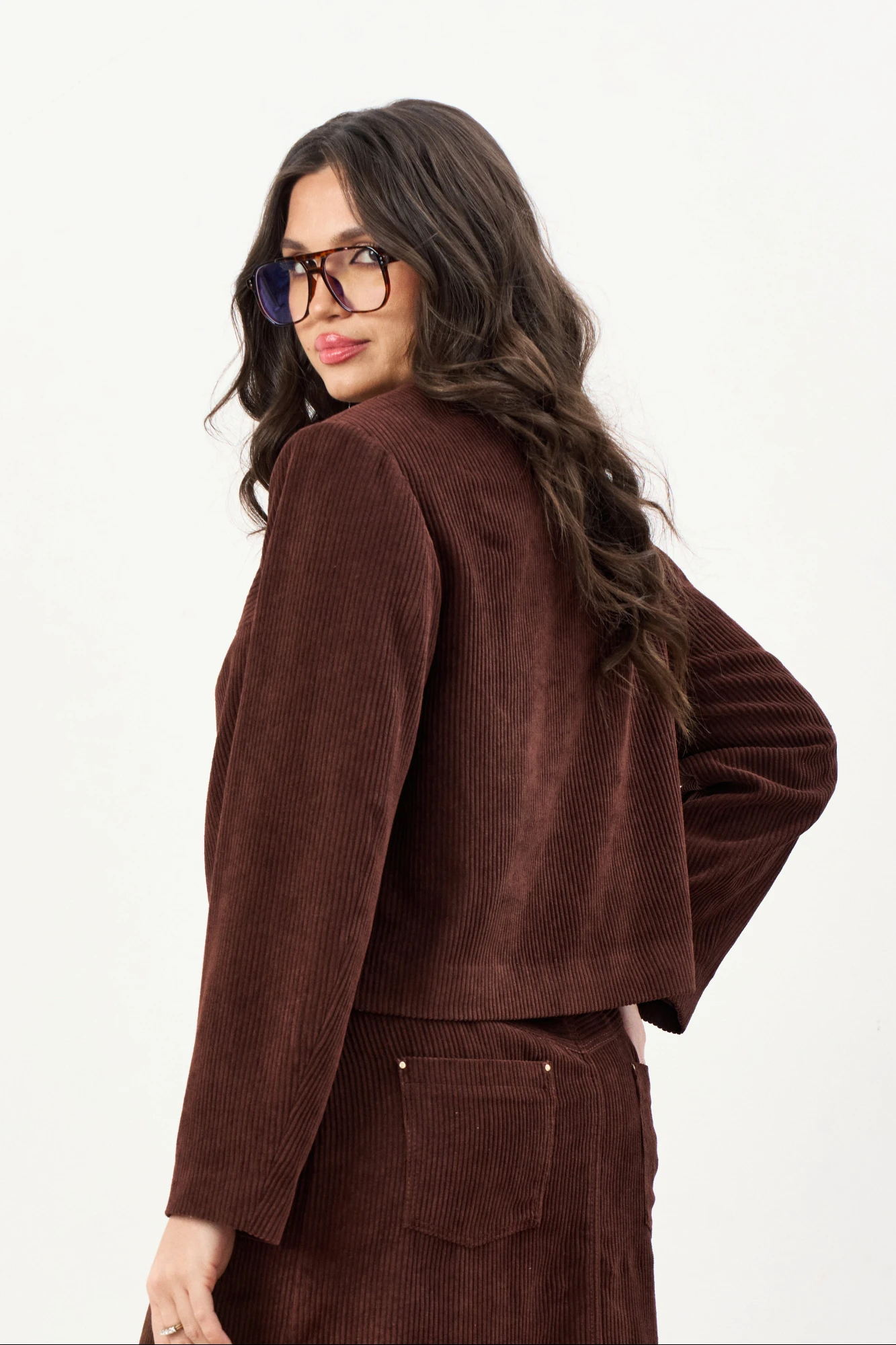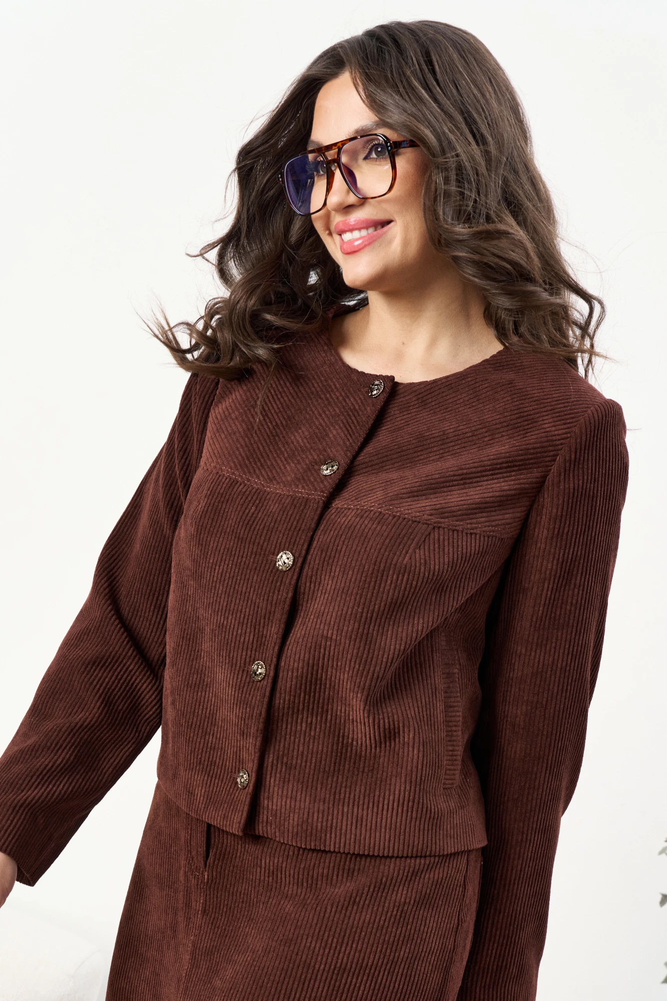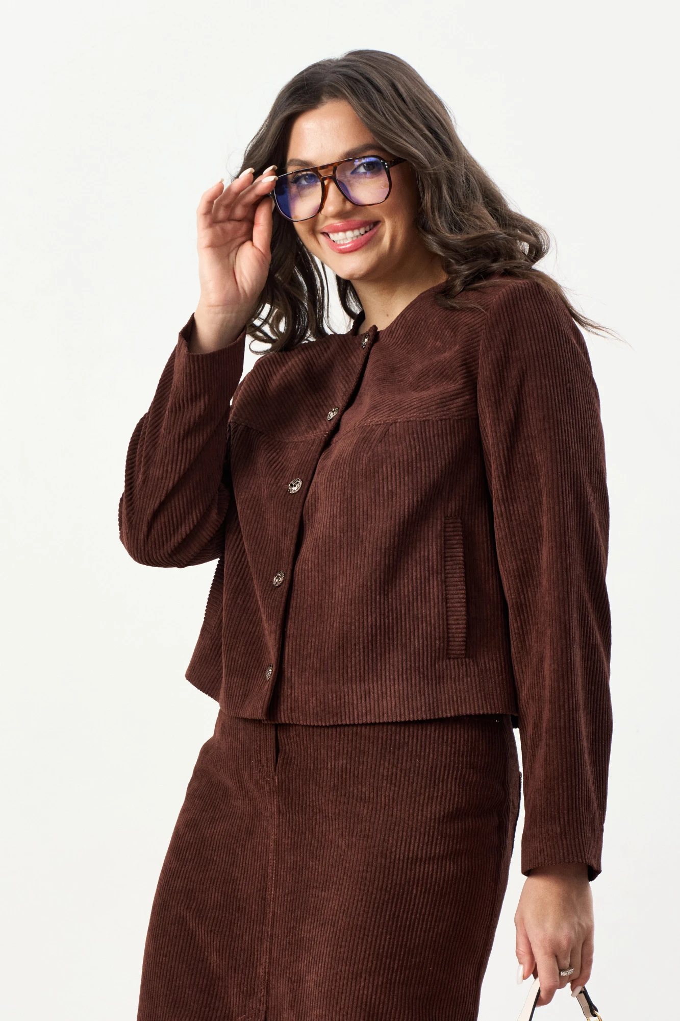 Жакет с округлым вырезом горловины и центральной застёжкой на пуговицы. Перед с отрезной кокеткой в верхней части и карманами в рамку в нижней. Рукава втачные. Жакет на подкладке.