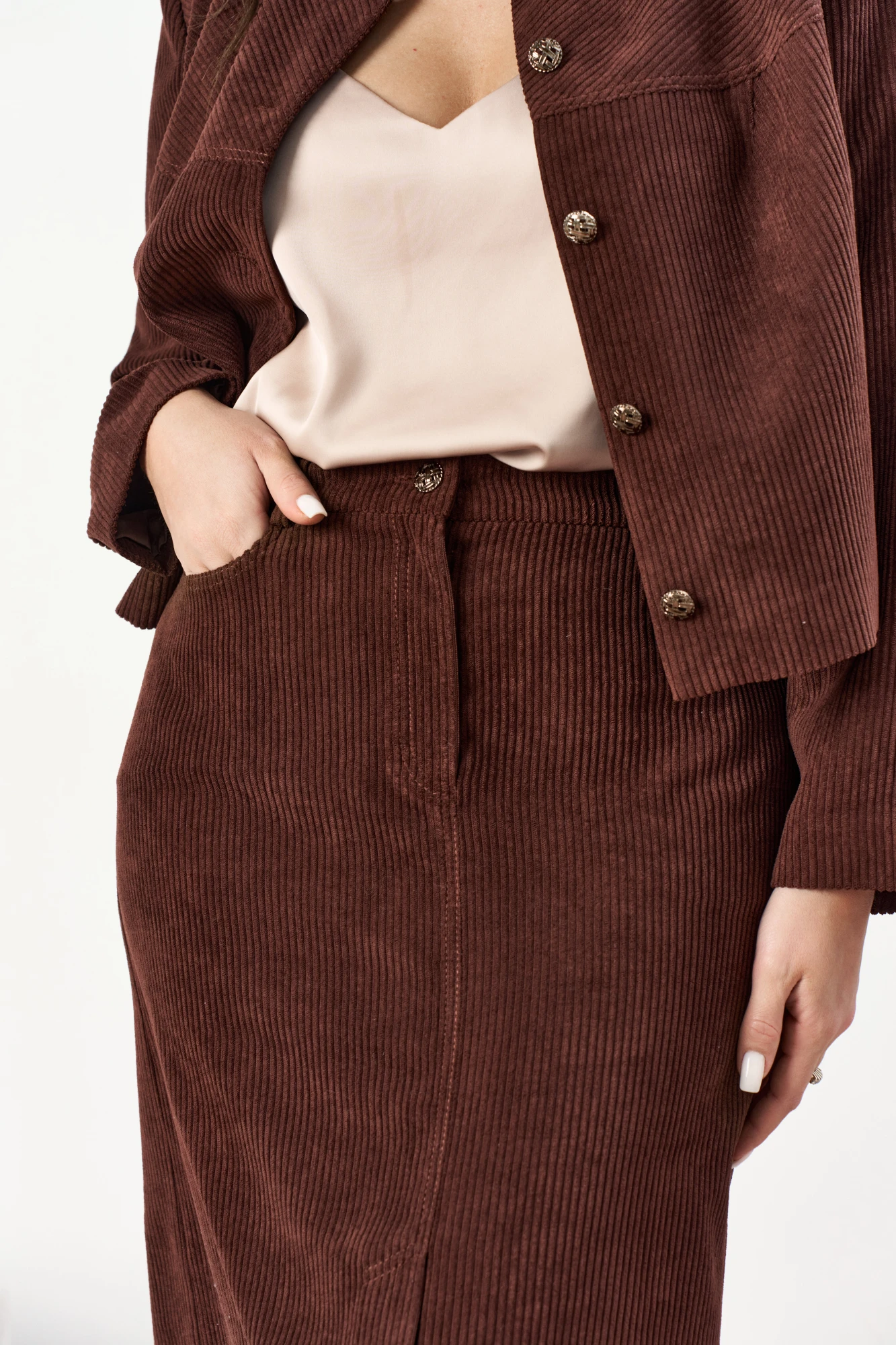 Юбка на поясе с резинкой. Переднее полотнище с застёжкой на молнию по центру, шлицей в нижней части по среднему шву и карманами в верхней части. Заднее полотнище с отрезной кокеткой и накладными карманами.