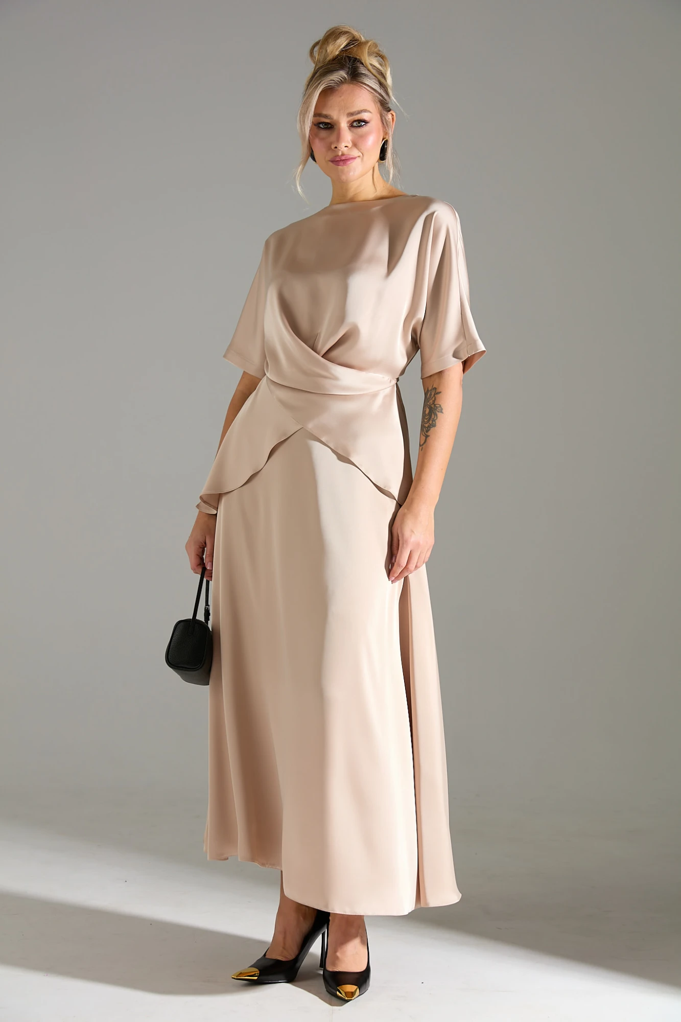 Костюм 2ка из лёгкой струящейся ткани с атласным благородным блеском, состоящий из блузки и юбки. Блузка свободного объёма, по переду имитация застежки на запАх. В комплекте шнур из основной ткани, которым можно приталить блузу, обвязав по кругу, или продеть через боковые швы и завязать по спинке. Юбка широкого объёма, длины "миди".