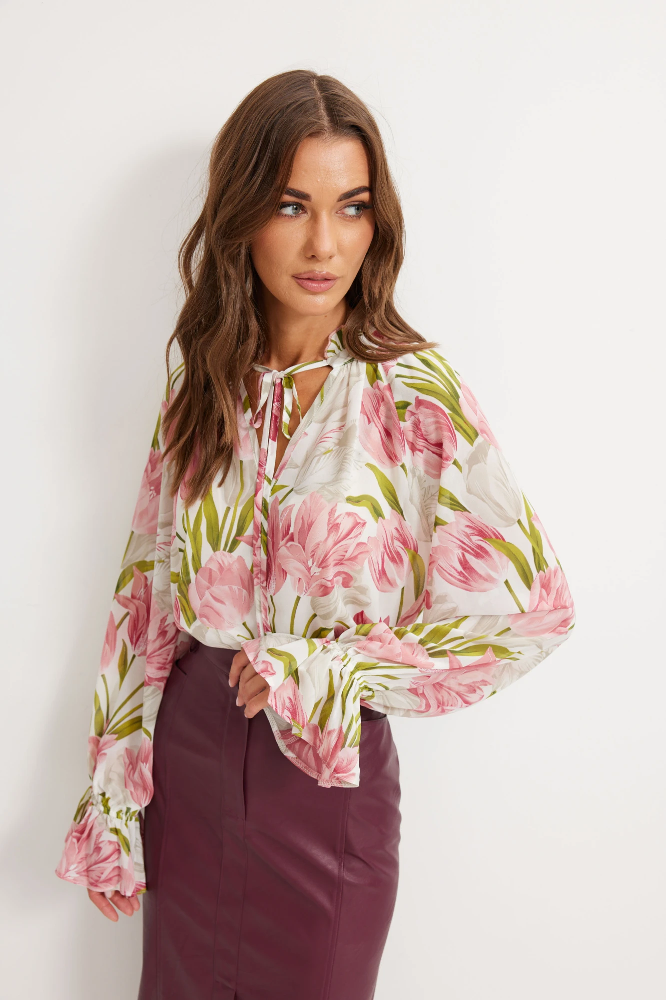 "Комплект =: Блуза прямого силуэта из шифоновой ткани. Воротник-стойка с завязками. По переду V-образный вырез, по горловине сборка. Рукав-реглан удлиненный, по низу волан собранный на резинку. В боковых швах по низу разрезы.