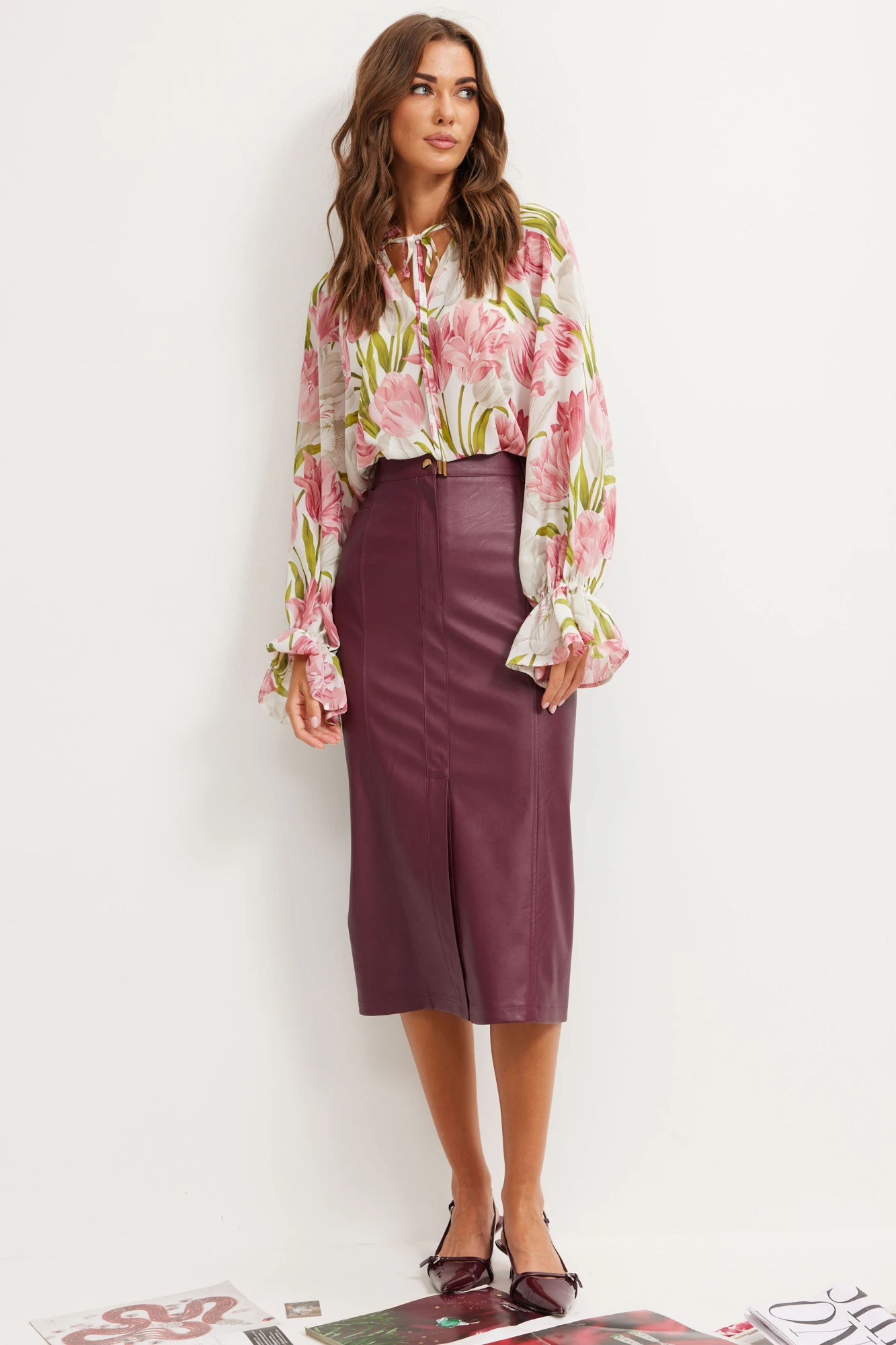 Юбка полуприлегающего силуэта из экокожи. По верху притачной пояс с застежкой на петлю и пуговицу и шлевками для ремня. На передних половинках обработаны карманы и застежка молния в среднем шве, а также шлица. На задних половинках рельефы. Обращаем ваше внимание, что фурнитура может отличаться от фото.