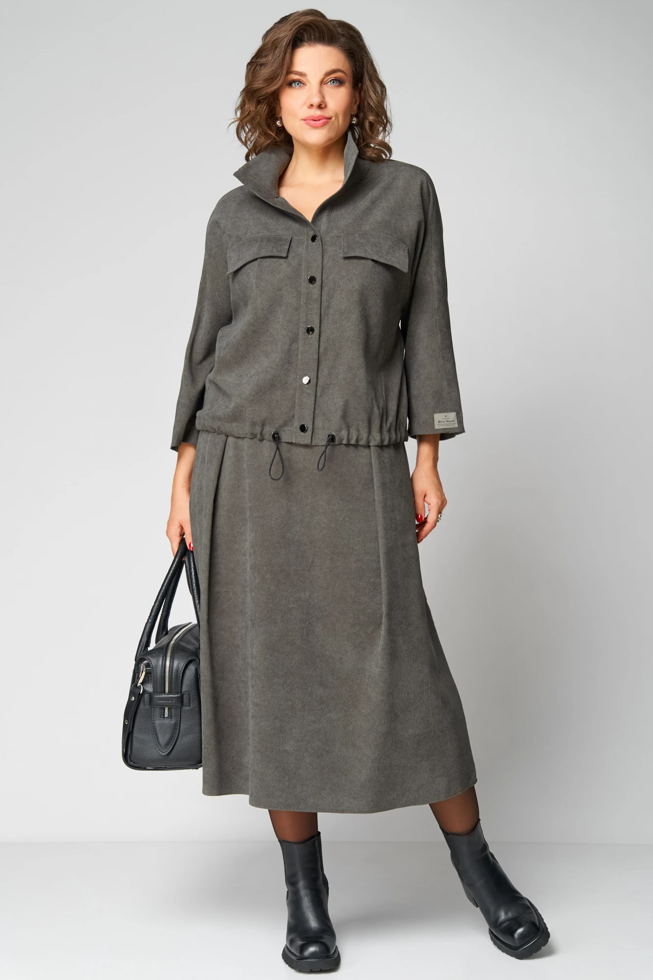 Комплект женский 2-ух предметный, состоящий из жакета и юбки. Жакет со спущенной линией плеча и цельнокроеным рукавом. По переду отрезная кокетка, воротник- стойка, рукава и планки. По переду настрочены нагрудные клапаны. Синка со средним швом. На левом рукаве о низу настрочена нашивка. Центральная застежка по планкам на 5 пуговиц и петель. Низ жакета можно регулировать с помощью эластичного шнура и фиксатора. Жакет без подкалки. Юбка на широкой обтачке А- силуэта, на подкладке. По переднему и заднему полотнищу заложены складки. По бокам расположены наклонные карманы. Застежка сзади на потайную тесьму-молнию.