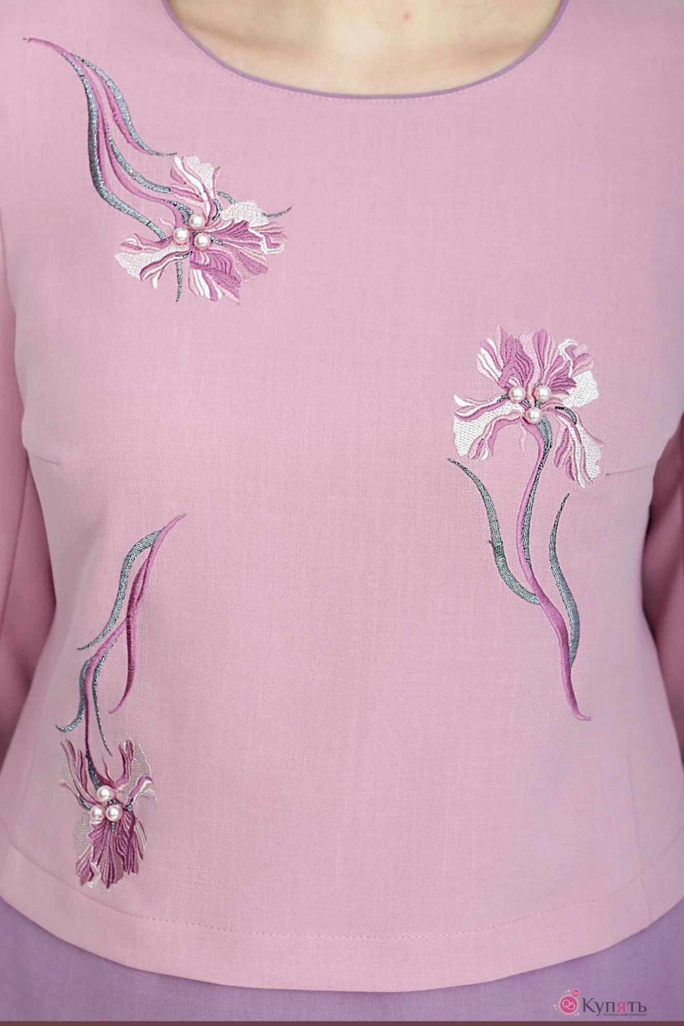 Полочка блузки декорирована дизайнерской вышивкой в виде цветов ( ирисы) с пришивными пуговицами. По низу блузки притачная деталь в тон юбки. Рукав втачной двушовный.Спинка с потайной молнией в среднем шве.Юбка прямая, заужена к низу, с подкладкой. Пояс притачной, по бокам резинка. На заднем полотнище юбки средний шов с молнией и разрезом.
