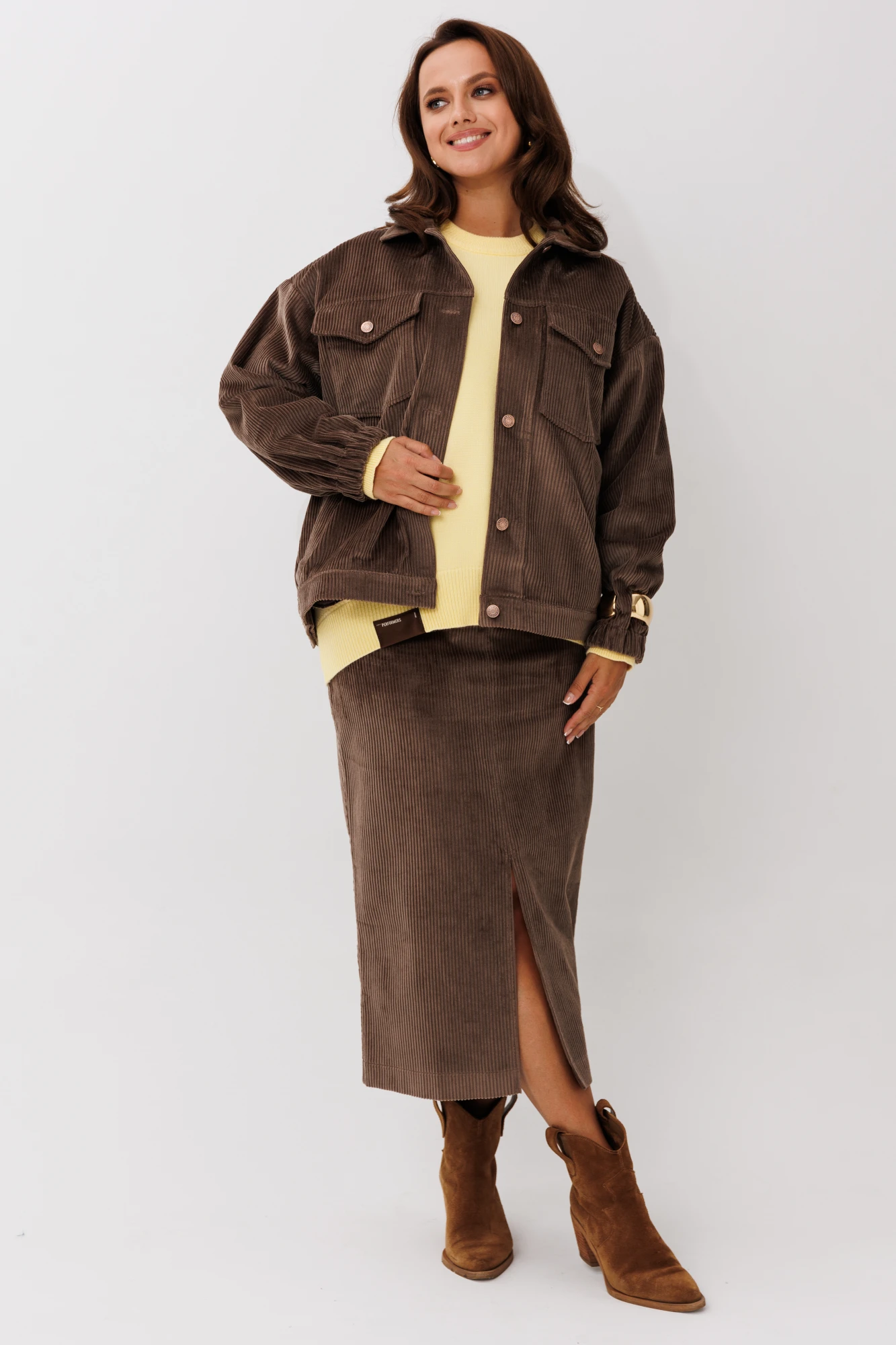 Комплект женский свободного силуэта состоит из бомбера и юбки. Бомбер со спущенными плечами застёгивается на прорезные петли и пуговицы. По переду прорезные карманы с широкой листочкой и накладные карманы с фигурными клапанами на застёжке. Воротник отложной. Рукава одношовные втачные на манжете. Юбка женская слегка зауженная к низу на притачном поясе со шлёвками, который застёгивается на прорезную петлю и пуговицу. По переду застёжка на молнию с гульфиком и откоском и карманы. По спинке центральный шов, заканчивающийся разрезом, кокетка и накладные карманы. Юбка и бомбер без подкладки.