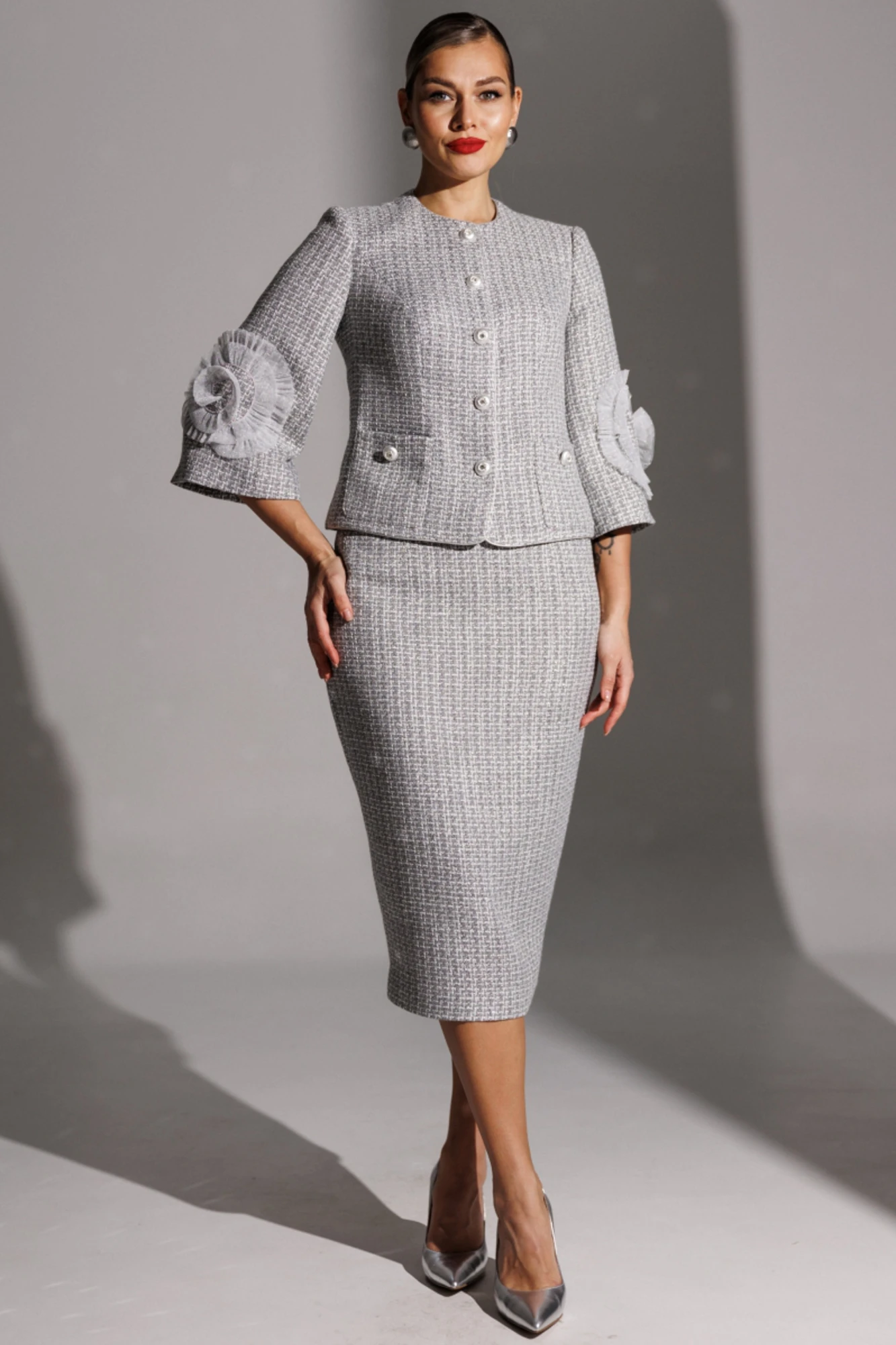 Костюм включает в себя стильный жакет и элегантную юбку. Жакет выполнен в полуприлегающем силуэте с центральной застежкой на пуговицы, что придает ему аккуратный вид. Спинка жакета имеет средний шов, а передняя часть украшена вертикальными рельефами и накладными карманами с пуговицей. Округлая горловина дополнена кантами по краю, что создает изящный акцент. Рукава длиной 3/4 слегка расширяются к низу и оформлены отделкой в виде цветка из отделочного материала, добавляя индивидуальности. Юбка имеет зауженный к низу силуэт и удобно сидит на притачном поясе с резинкой, обеспечивая комфорт. Молния и шлица расположены в среднем шве. Весь костюм подкладке, что придает ему дополнительный комфорт и завершенность.