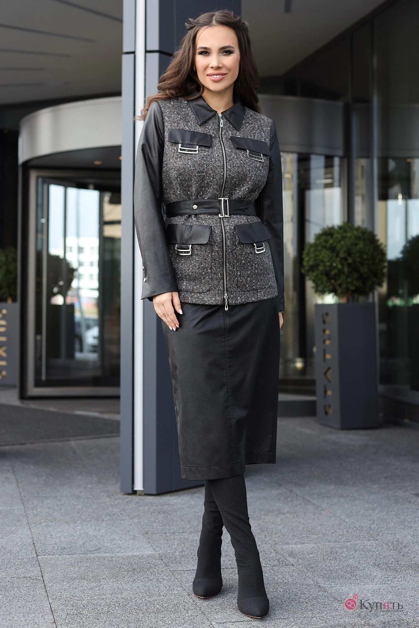 Костюм женский в оригинальном сочетании буклированного материала и эко-кожи создает потрясающе стильный образ. Жакет полуприлегающего силуэта с центральной застежкой на молнию. По переду кокетки и накладные карманы с клапанами из кожи, декорированные металлическими рамками. Воротник стояче-отложной, рукава с шлицами и кнопками, также выполнены из кожи. Спинка со средним швом и талиевыми вытачками. Жакет дополнен съемным поясом с рамкой и кнопками. Юбка зауженная к низу. Молния и шлица в среднем шве. Линия талии завышена, на обтачке. В области талии шлевки для съемного декоративного пояса. Костюм на подкладке.