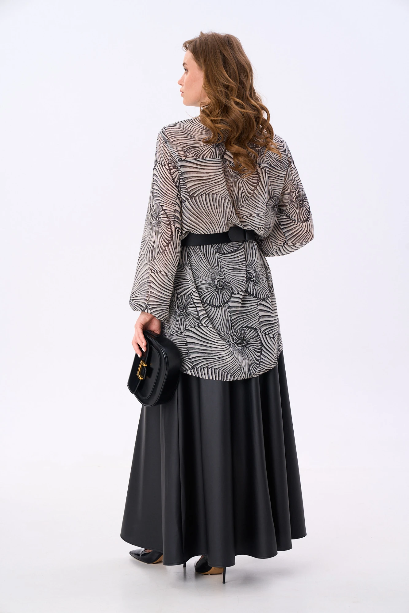 Костюм двухпредметный: состоит из блузы и юбки. Блуза свободного прямого кроя прямого силуэта с V-образным вырезом. Воротник стояче-отложной рубашечного типа, застёгивается на пуговицу и петлю. Рукава объёмные, собраны на резинку. В боковых швах и по переду разрезы.Юбка - солнце с узким поясом. В боковых швах расположены карманы. Застёжка на петлю и пуговицу и молнию по спинке. В комплект входит ремень из экокожи.