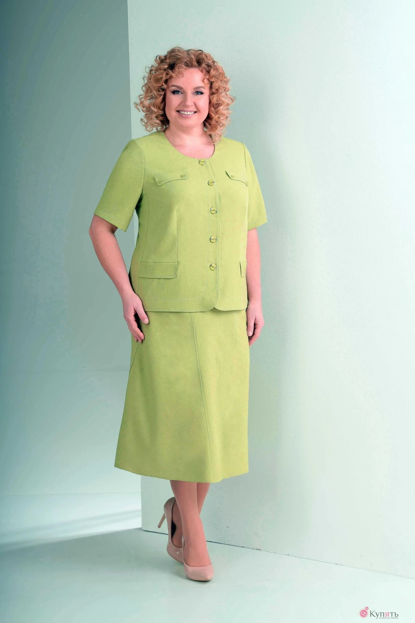 Комплект юбочный, состоящий из жакета и юбки, из текстильной ткани. Жакет на застежке из пуговиц. На груди и чуть ниже линии талии имеются декоративные клапаны. По бокам жакета внизу разрезы. Юбка на поясе со вставками резинки по бокам. Застежка сбоку на потайную молнию и пуговицу. Юбка на подкладке,.расширенная книзу за счет раздвинутых декоративно клиньев.