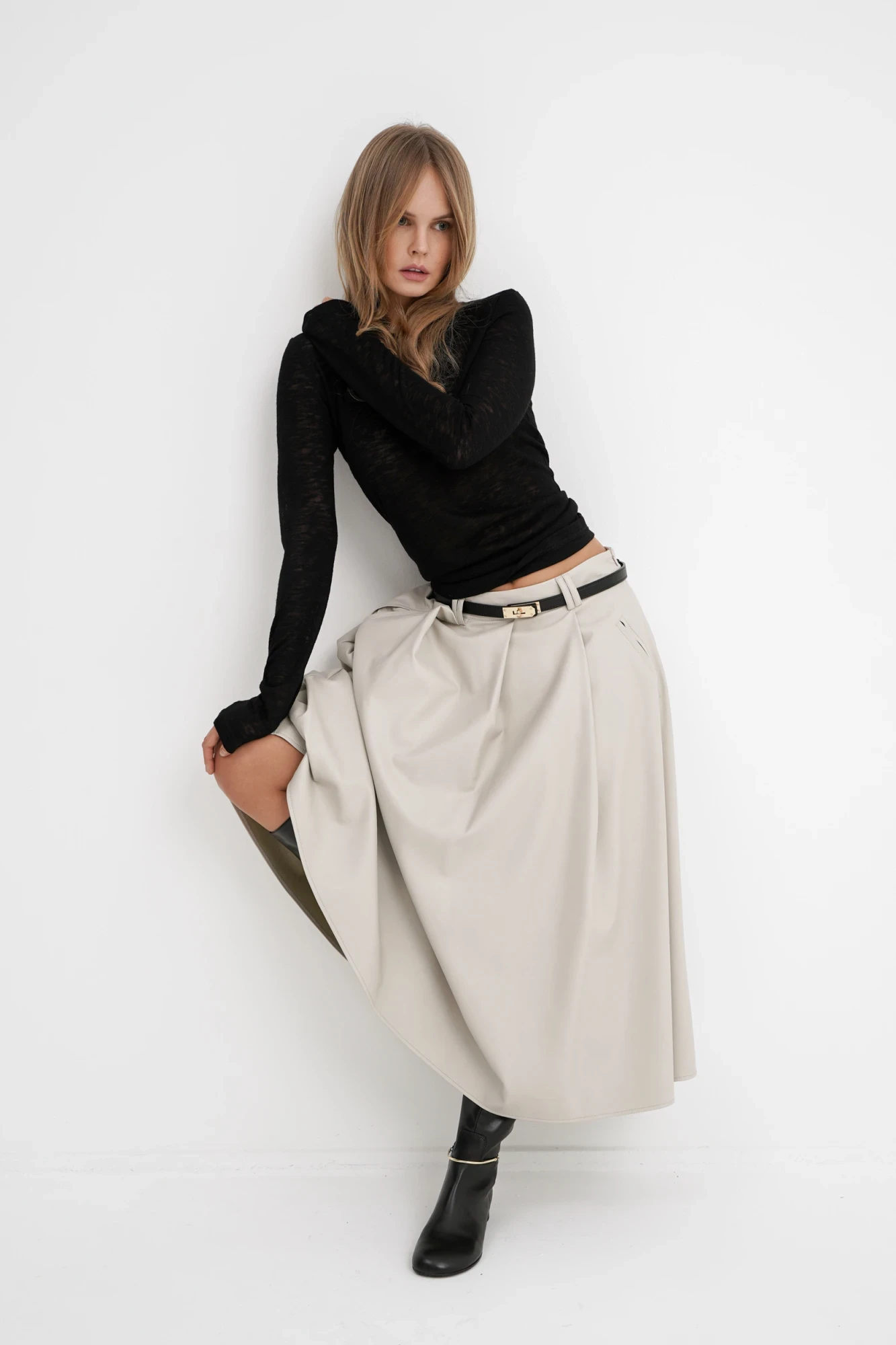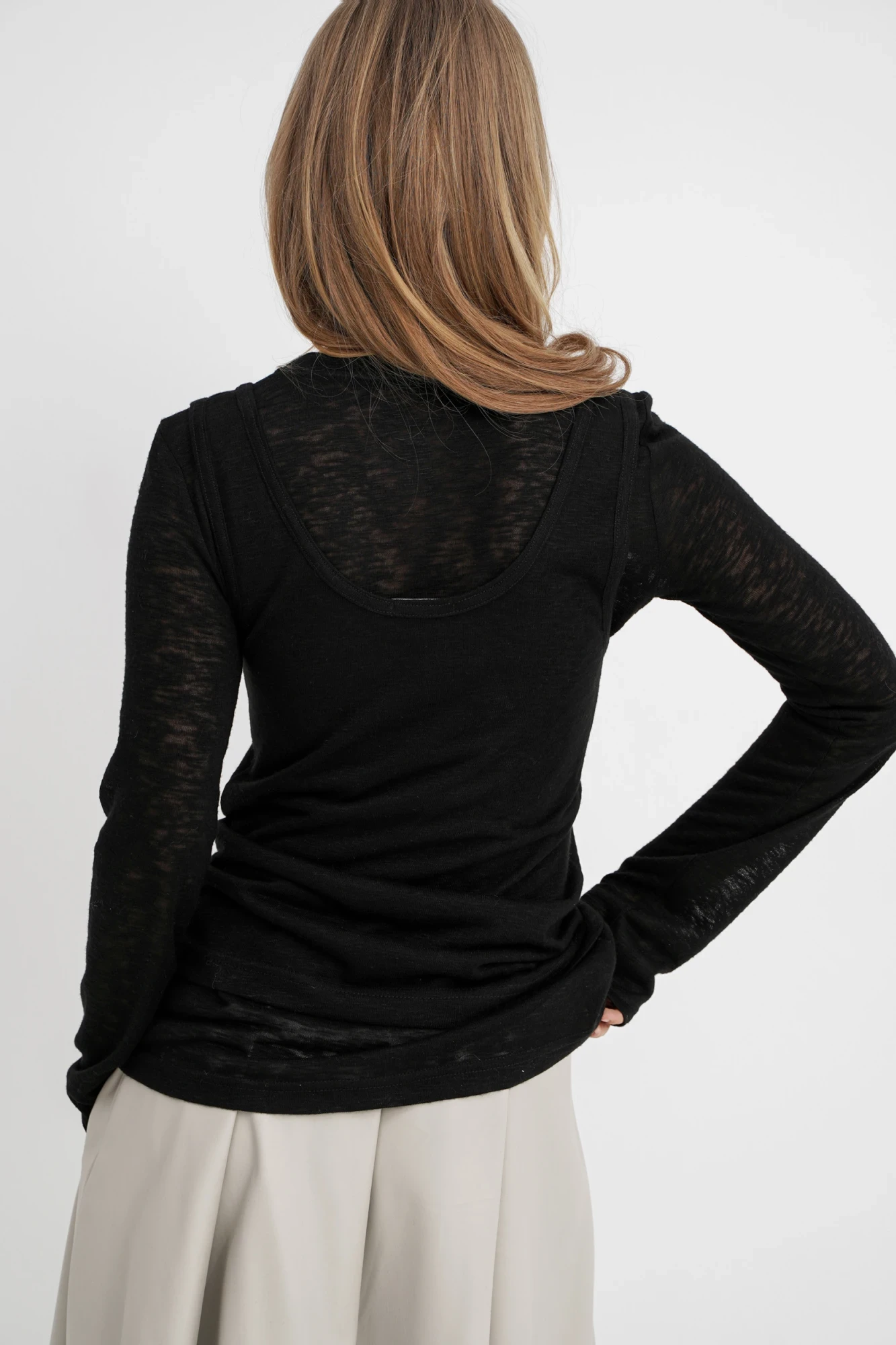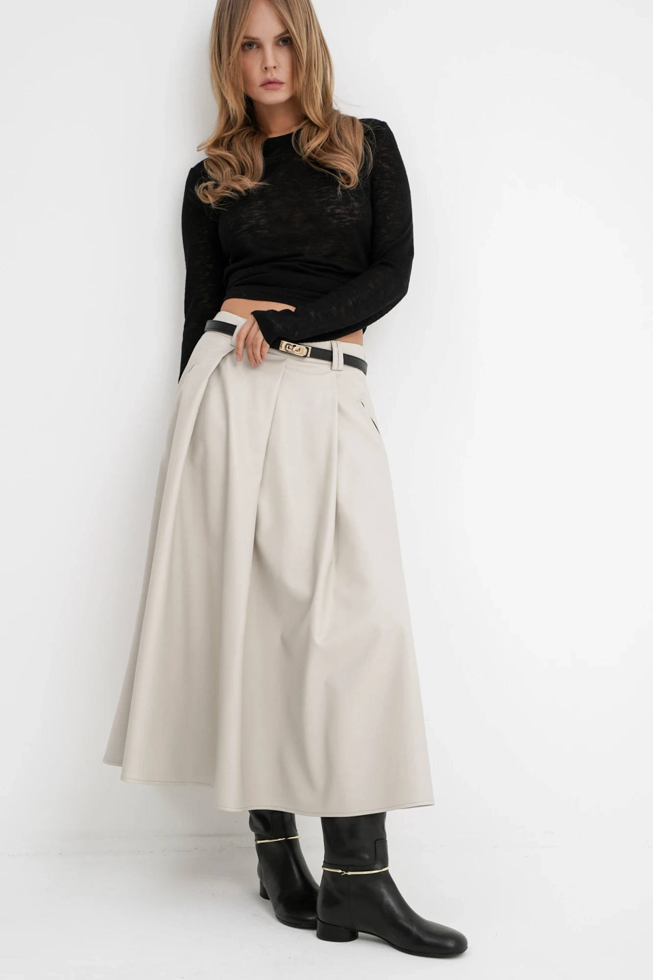 Комплект-двойка из трикотажного лонгслива с майкой и миди-юбки из экокожи. Детали: лонгслив полуприлегающего силуэта, длинные втачные рукава. Майка съемная. Юбка на притачном поясе со шлевками, прорезные карманы, застежка на потайную молнию в левом боковом шве, юбка на подкладке. Длина лонгслива по спинке около 60 см в размерах 40-46 и около 63 см в размерах 48-52, длина рукавов около 65 см. Длина юбки по боковому шву с поясом около 80 см.