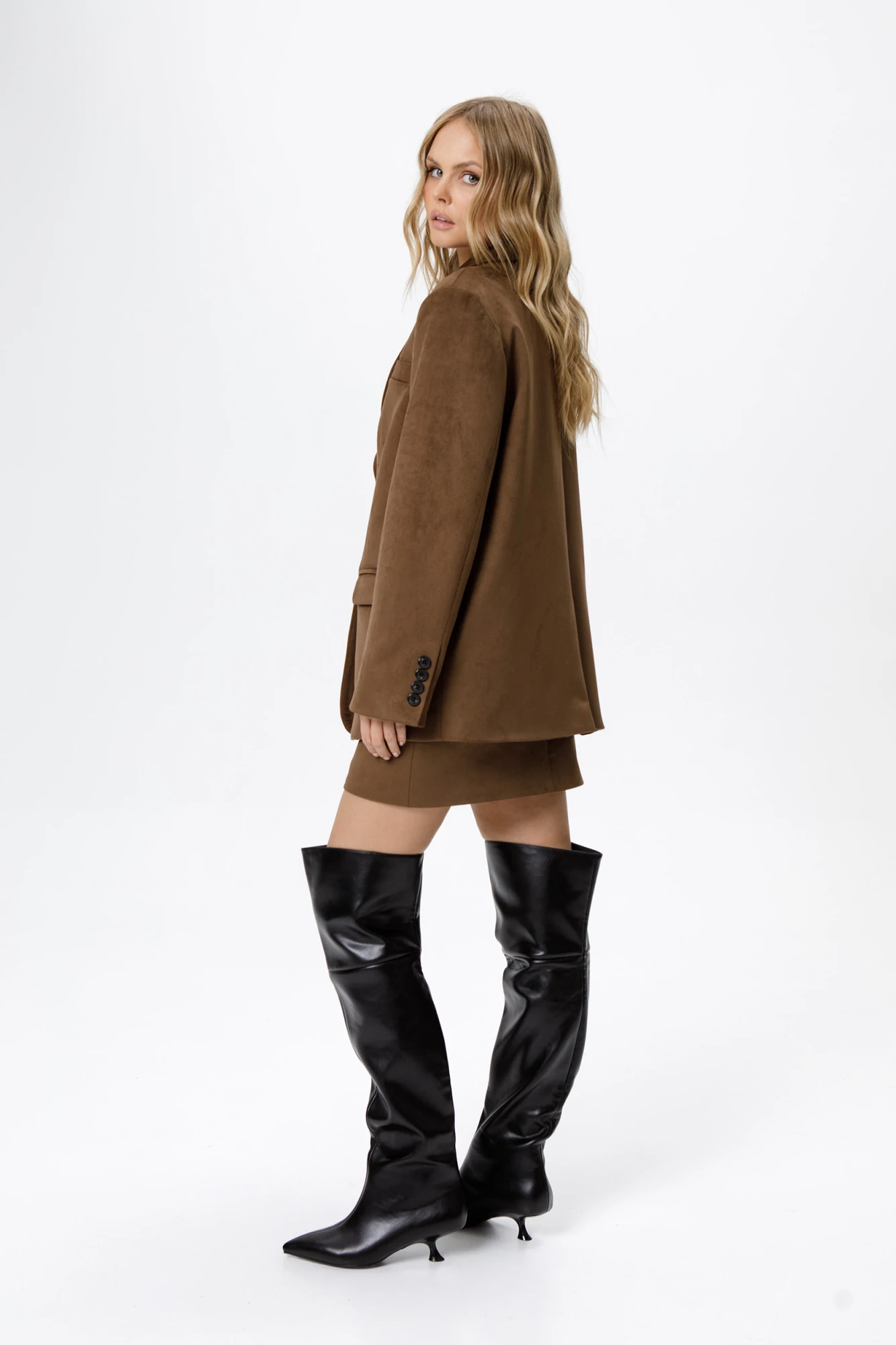 Костюм-тройка из оверсайз жакета, прямого жилета и мини-юбки из ткани под замшу.