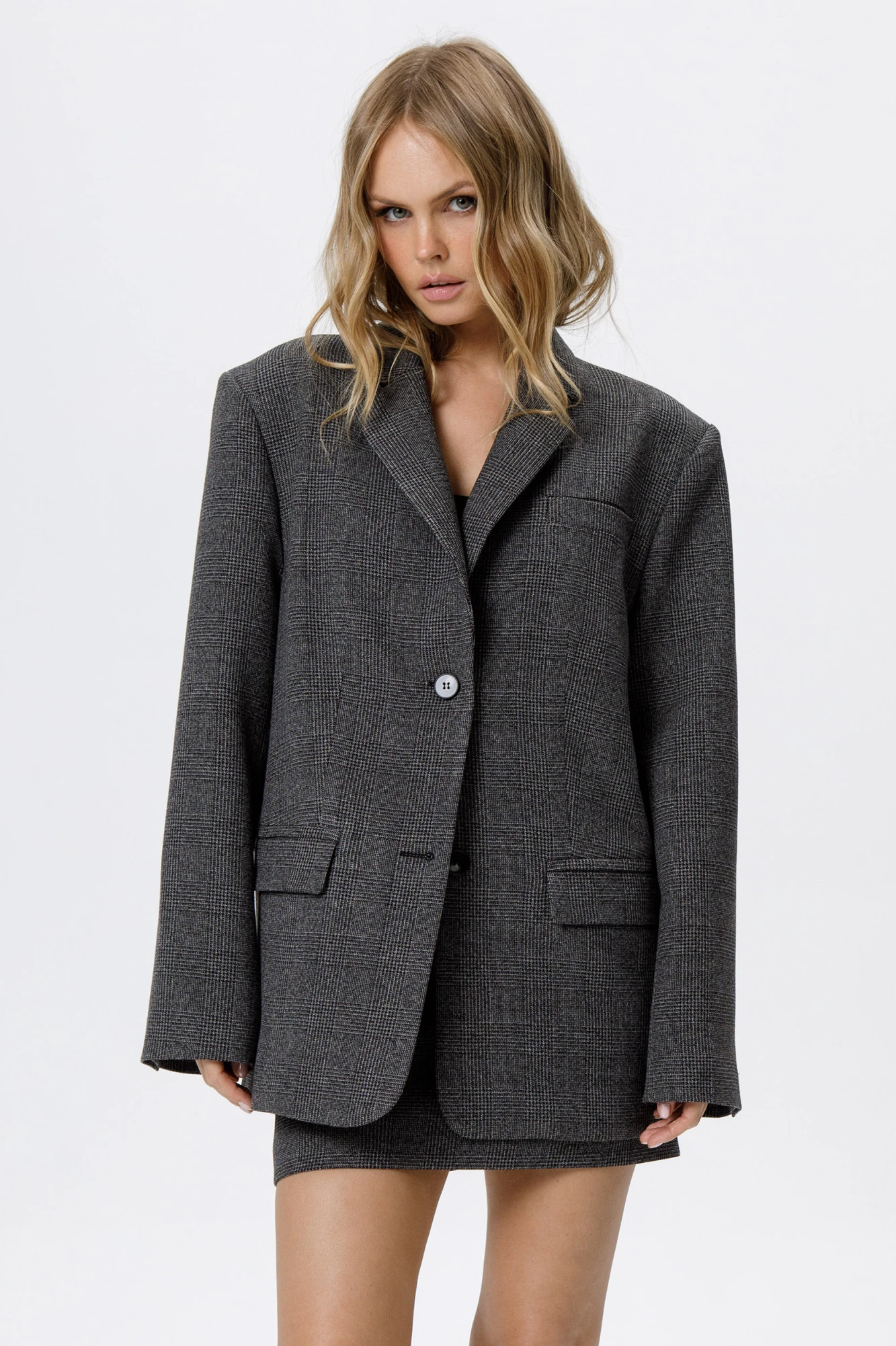 Костюм-двойка из оверсайз жакета и мини-юбки из текстильной ткани в клетку.