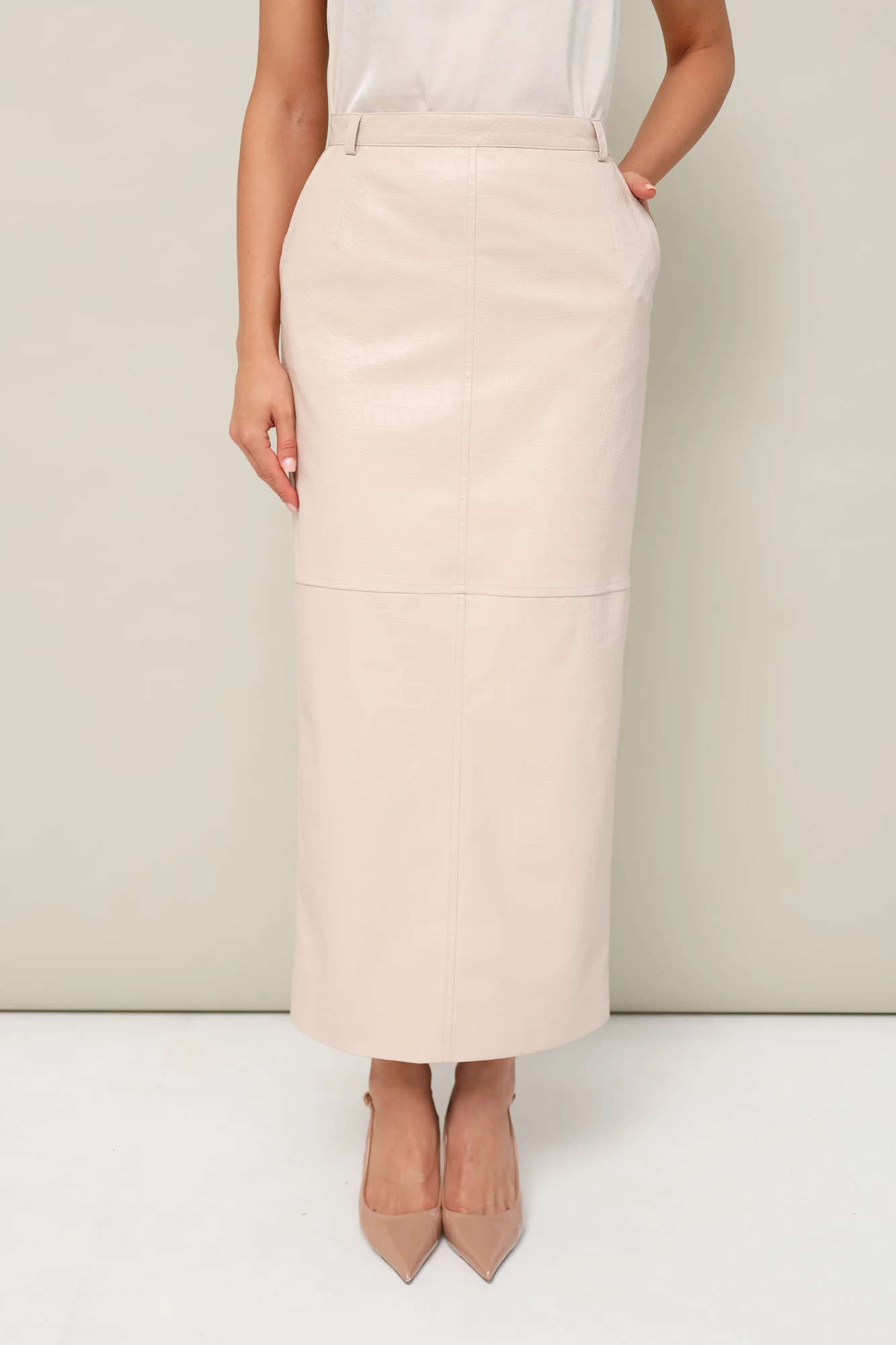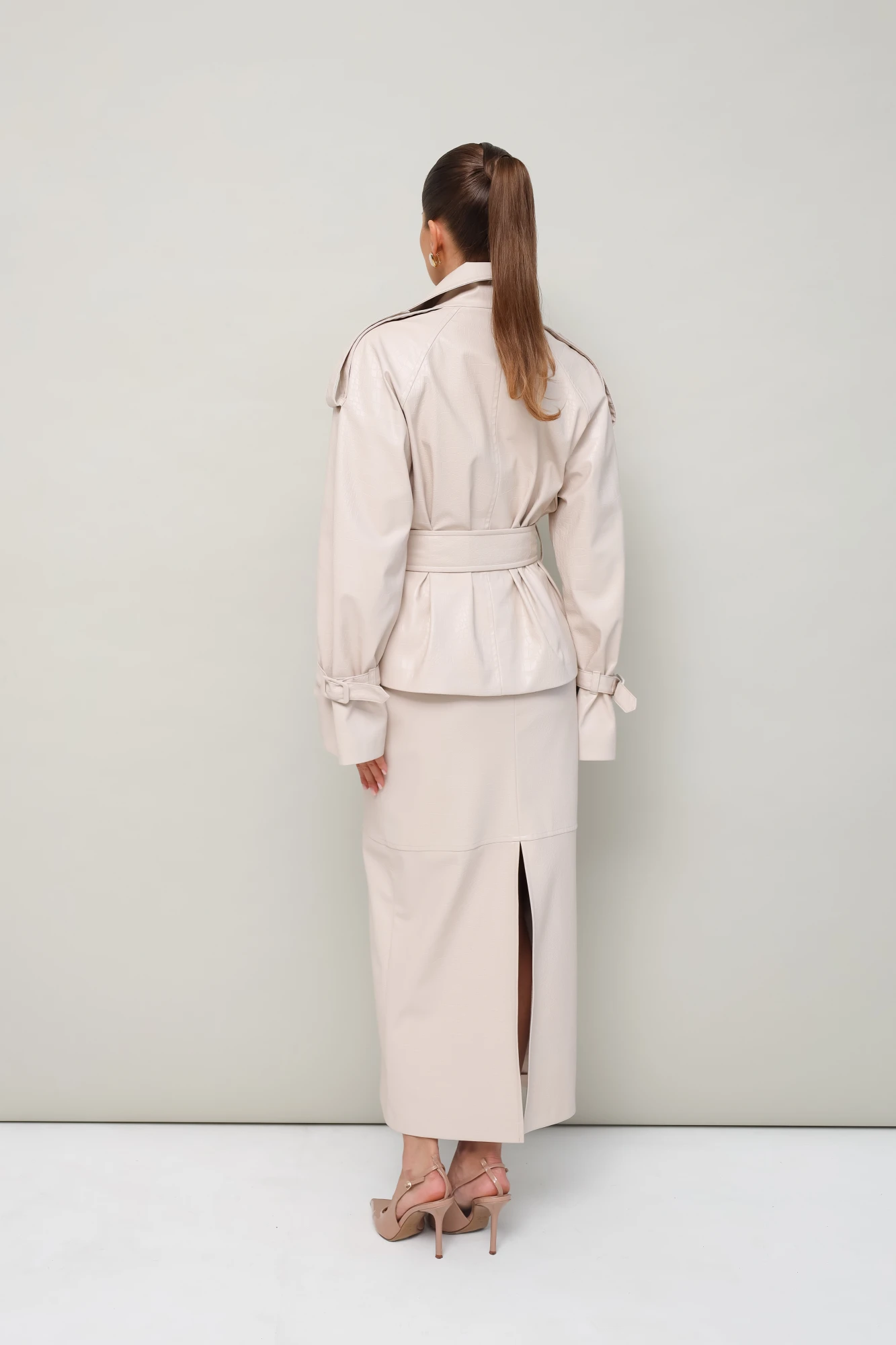 "Стильный 2-предметный комплект, состоящий из жакета и юбки, выполненный из экокожи.