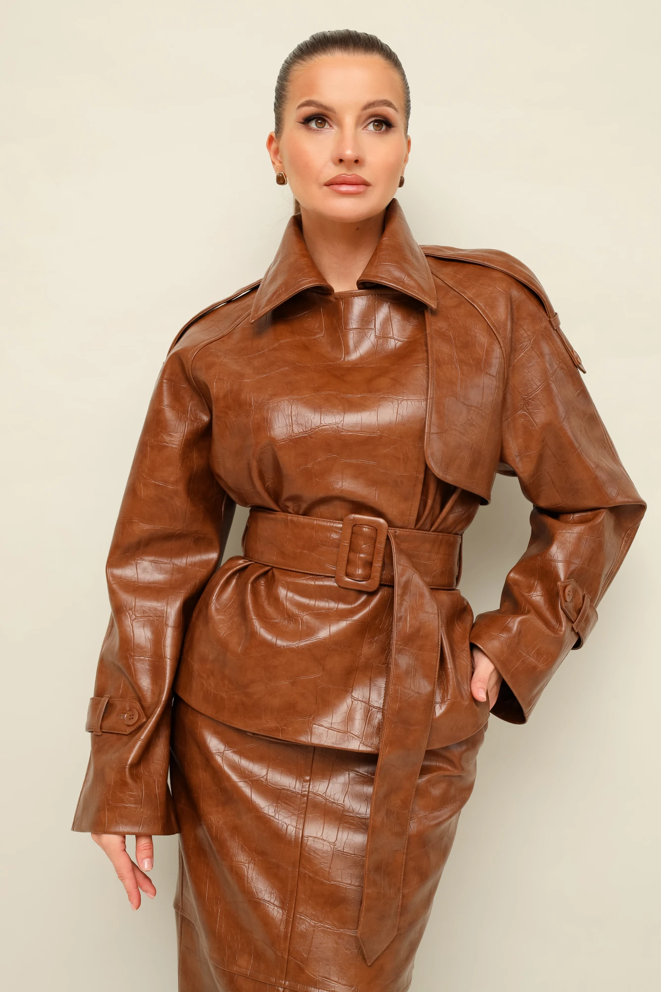 Стильный 2-предметный комплект, состоящий из жакета и юбки, выполненный из экокожи.
