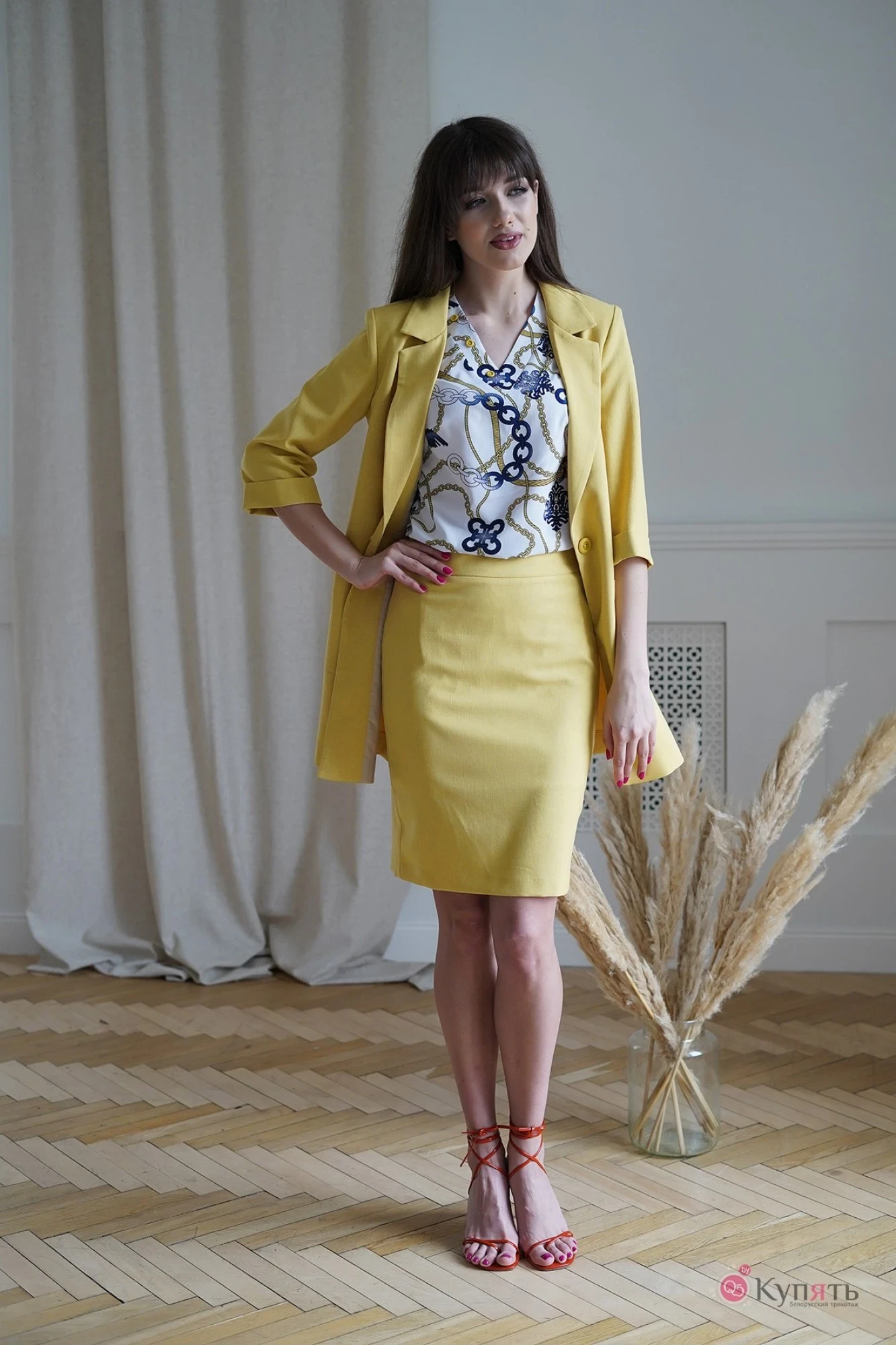 Комплект женский 3-х предметный. Состоит из жакета, юбки и блузки. Жакет удлиненный приталенного силуэта. Перед с рельефами и накладными карманами. Застежка центральная на одну петлю-пуговицу. Воротник стояче-отложной. Спинка с среднем швом и талиевыми выточками. Рукав двухшовный, втачной с отворотом по низу.