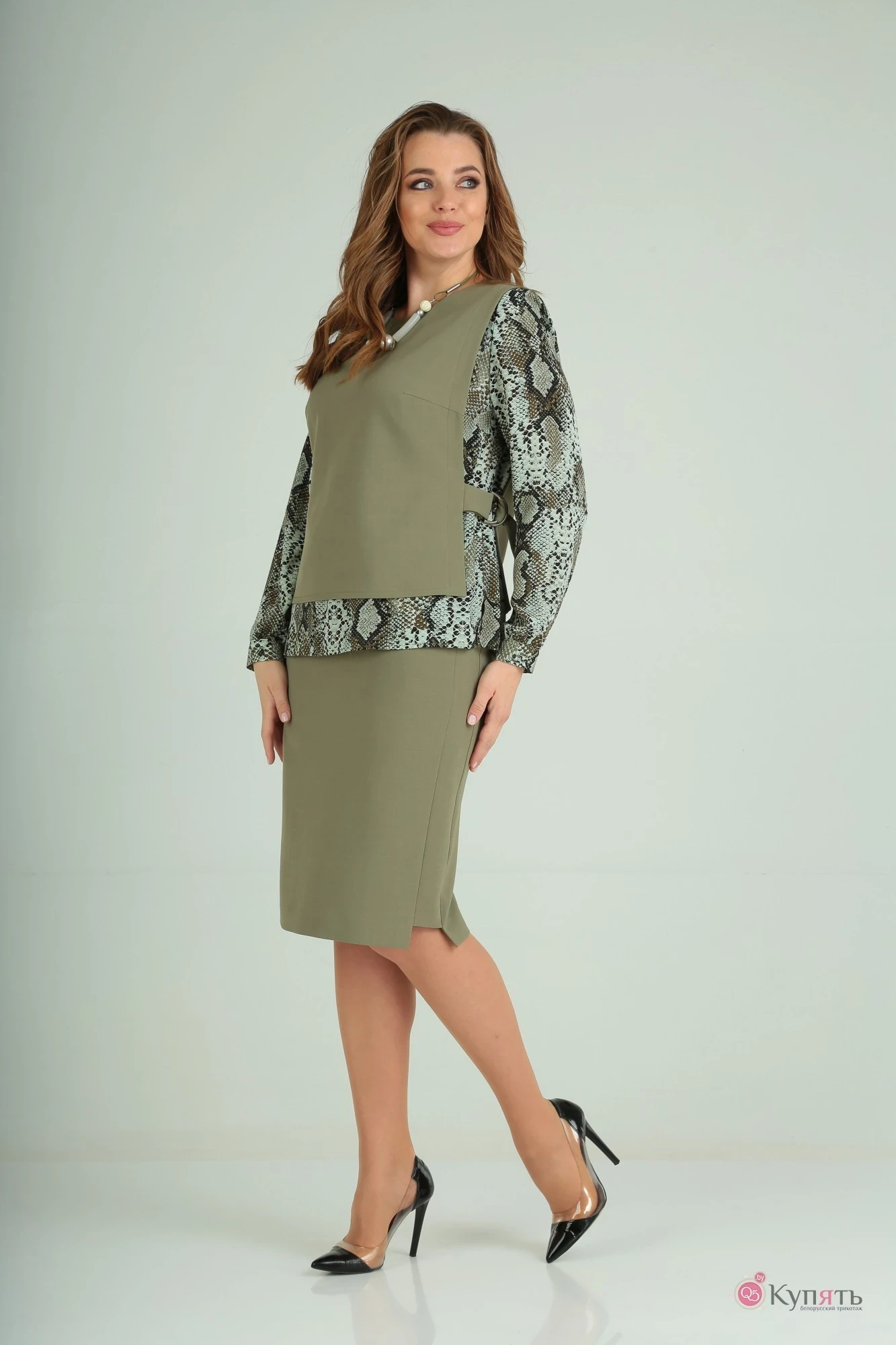 Комплект женский двухпредметный. Блуза свободного силуэта их шифоновой ткани с имитацией жилетки из отделочной ткани. По бокам хлястики с пряжкой, позволяющие регулировать прилегание по линии талии. Горловина округлая. Рукав длинный одношовный, втачной. Юбка прямая. Верх переда и спинки на кокетке. По спинке два декоративных кармана и шлица. Юбка на подкладке. Комплект дополняется съемным украшением.Длина рукава 60 см, длина блузы 62, Длина юбки 64 см