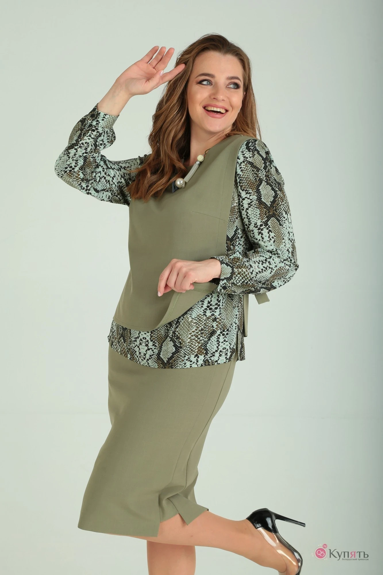Какой замечательный комплект! Выглядит как на фото модели! Ткань юбки и жилетки держит форму, практически не мнется, чуть тянется и удачного гармоничного цвета. Ткань блузы не тянется, но в ней комфортно. Прилагается оригинальное съемное украшение (на фото модели другое, но пришло ничуть не хуже). С размером совпадает. Очень рекомендую такой стильный костюм.