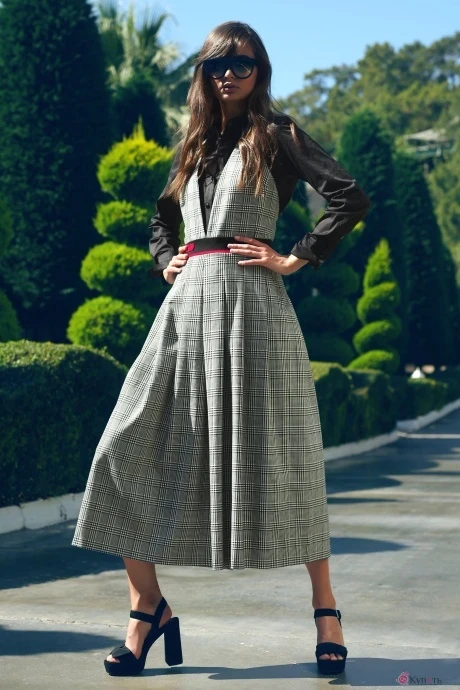 Восхитительный комплект. Комбинезон выполнен из костюмной ткани, лиф на подкладке. Застежка на потайную тесьму-молнию в среднем шве спинки, по спинке бретели с застёжкой на петлю и пуговицу (длина регулируется). По талии вставлен контрастный пояс, по низу заложены складки вкруговую, в боковых карманы в отрезном бочке. Комбинезон декорирован пришивным логотипом VL. Блузка прилегающего силуэта, выполнена из хлопковой ткани. По горловине – стойка, спереди планка с застежкой на петли и пуговицы. Рукав втачной, по низу манжет 10см.