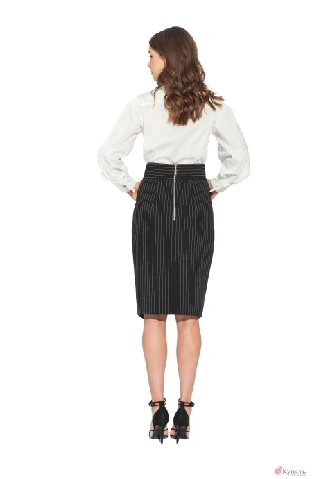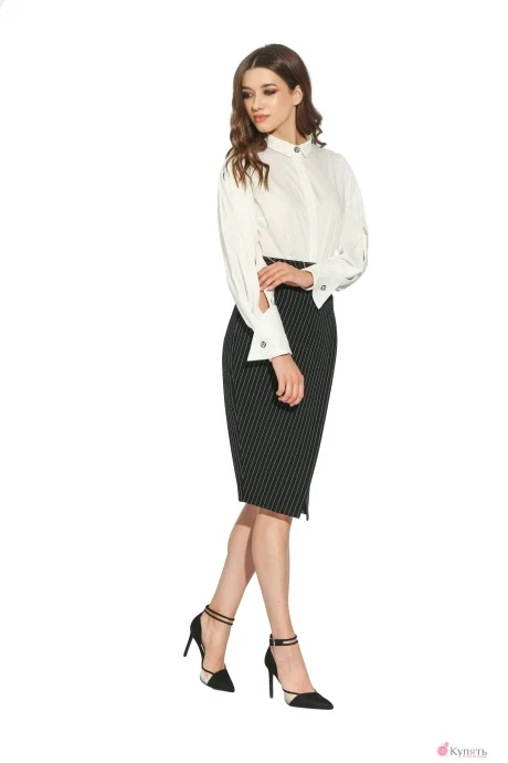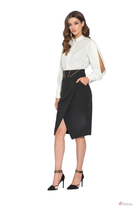 Комплект блузка и юбка. Блузка прилегающего силуэта, выполнена из хлопкового полотна. Спереди планка с потайной застежкой на петли и пуговицы. Воротник отложной на стойке. Рукав втачной с заложенными складками по окату и декоративным разрезом, по низу манжет с отворотом. Юбка с высокой "посадкой", спереди на запах. Выполнена из костюмной ткани, на подкладке. Застежка на отделочную тесьму-молнию в среднем шве спинки. Верхний срез обработан поясом 7 см. По боковым вставлены карманы в отрезном бочке.