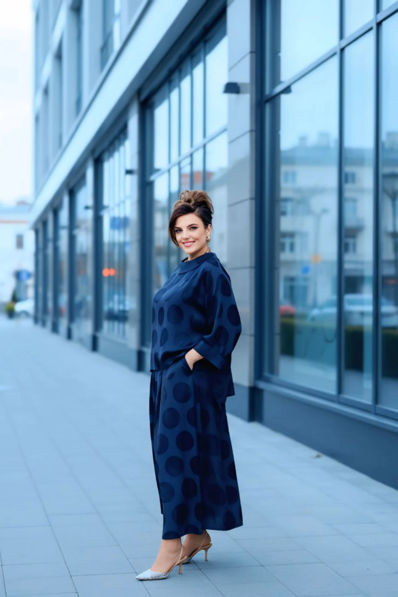Костюм женский, двух-предметный, состоящий из блузки и брюк-кюлот. Этот костюм воплощает собой непринуждённую элегантность. Ненавязчивый гороховый принт ткани является главным акцентом придавая образу игривое очарование, добавляя костюму динамики и лёгкой ретро- нотки. Данный комплект отлично подходит для торжественных мероприятий, свиданий, работы в офисе если дополнить его соответствующими аксессуарами и обувью. Блузка свободного силуэта струится по фигуре, будто соткана из воздуха, её расширенный крой создаёт ощущение невесомости. Горловина округлой формы с отложным воротником на стойке фигурной формы переходящим на спинку из отделочной ткани. По спинке вырез капелька с застёжкой на пуговицу, спинка со средним швом. Рукав цельнокроены с со сборкой на притачной манжет по низу. Боковой шов слегка переходит на перёд. Низ в блузке ассиметричный с разрезами в боковых швах. Брюки-кюлоты широкие и летящие, танцуют с каждым шагом. Укороченная длина открывает лодыжки делая силуэт воздушным. Брюки-кюлоты свободного силуэта, длиной 7/8 расширяются к низу. Пояс притачной со вставкой эластичной тесьмы-резинки, которая обеспечивает максимально удобную посадку на любой тип фигуры. По переду брюк от верха застрачиваются складки. В задней части брюк застёжка на тесьму-молнию в шве и пуговицу в поясе. В боковых швах брюк - карманы.