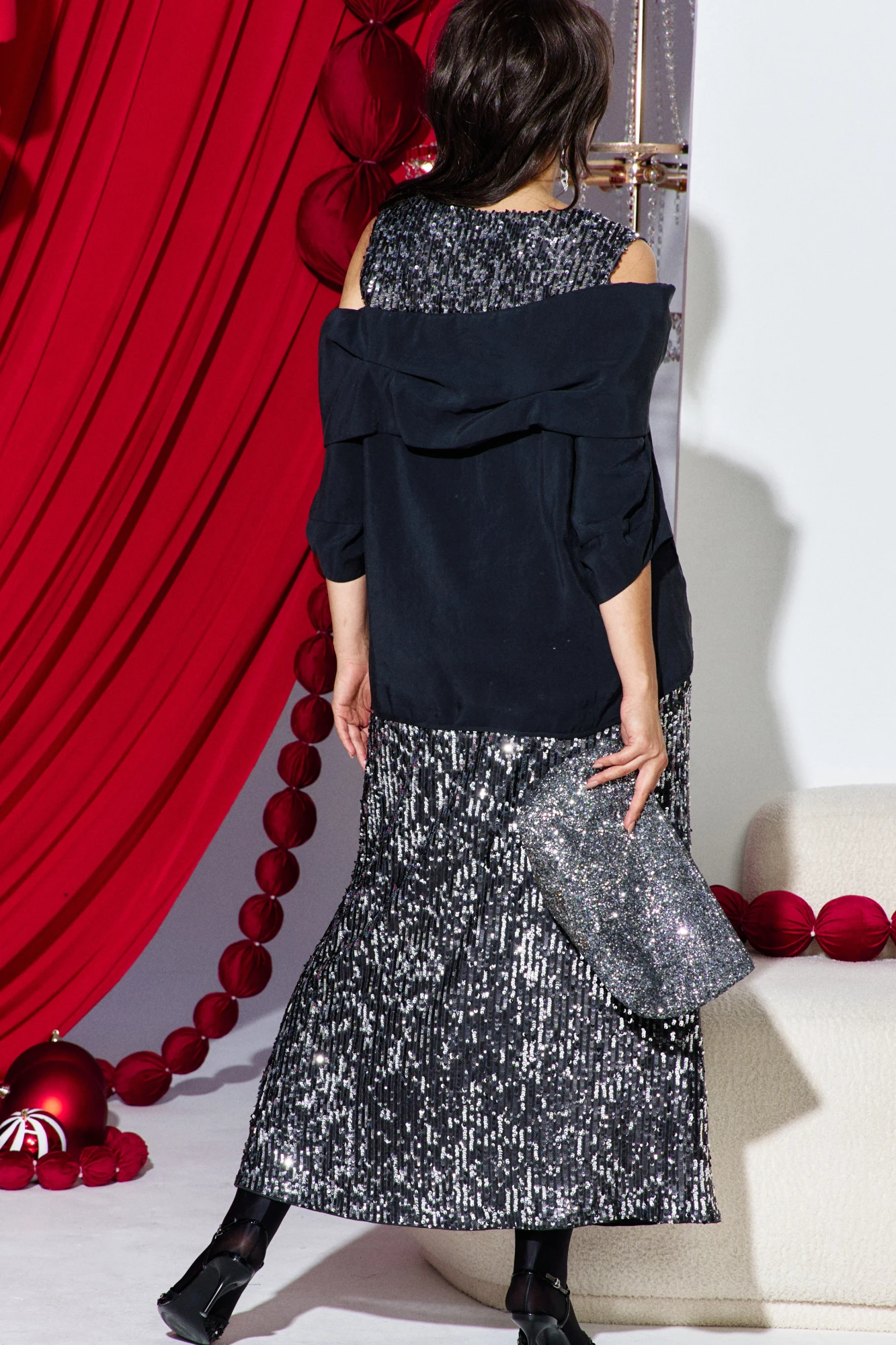 Этот юбочный комплект — для женщины, которая не боится владеть вниманием. Если Вы ищете идеальное сочетание стиля и комфорта, вот идеальный выбор. Комплект женский, состоящий из блузона и юбки. Блузон ( состав: 85% модал, 15% полиэстер ) — это настоящая скульптурная форма. Он начинается с откровенной игры линий: мягко ниспадая с плеч, он обнажает изящные ключицы и линию декольте. Блузон свободной формы с ассиметричным вырезом декольте, отложным воротником с декоративными защипами. По переду и спинке блузона отрезная кокетка из отделочной ткани — пайетки. Низ в платье ассиметричный, боковой шов в блузоне переходит на перёд. Рукав втачной, фигурной формы с декоративным подрезом, длиной ¾. Юбка (состав: 100% полиэстер, подкладка 100% полиэстер) длины « миди», прямого силуэта немного расширяется к низу. Пояс в юбке цельнокроеный с эластичной тесьмой-резинкой. Длина миди придаёт образу неустаревающую классику и грацию. Плотное полотно, сплошь усыпанное мелкими пайетками графитового и серебристого оттенков, не просто отражает свет, а мягко излучает собственное, приглушённое свечение. Юбка на подкладке.