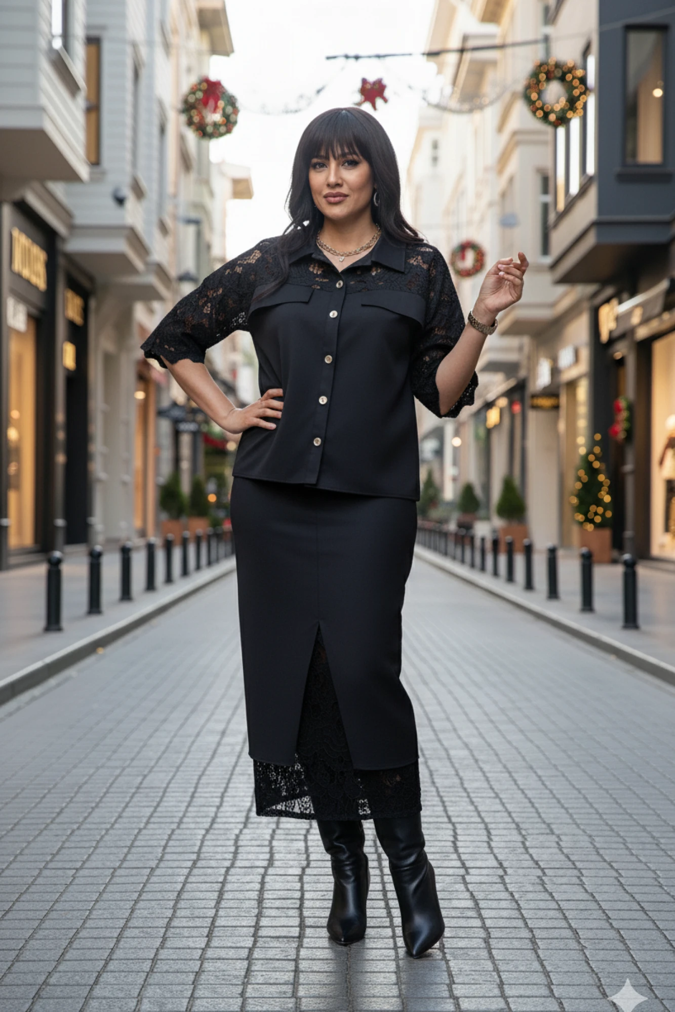 Костюм юбочный женский, состоящий из блузки и юбки. Комбинация однотонного хлопка и вышитого гипюра в тон создаёт ощущение монолитности и изысканности. Верх и низ костюма образуют единое целое: простая, сдержанная геометрия блузы подается как холст для элегантности юбки, превращая костюм в идеальный выбор для событий, где важна сдержанность и сила стиля.Блузка свободного силуэта, укороченная, с центральной застёжкой на петли-пуговицы по планке, низ в блузке ассиметричный. Воротник в блузе рубашечного типа. По переду блузки отрезные кокетки из отделочной ткани в тон- гипюра на просвет, декоративными клапанами. Спинка в блузке с отрезной кокеткой из отделочной ткани в тон-гипюра на просвет. В боковых швах блузки разрезы с декоративным элементом в виде паты, фиксирующейся отделочной пуговицей. Рукав в блузке втачной, длиной ¾, из отделочной ткани-гипюра с фестонами по низу.Юбка прямого силуэта, длины миди, с застёжкой на тесьму-молнию в гульфике и пуговицу в поясе, по переду юбки средний шов переходящий в разрез, и прорезные карманы. Заднее полотнище юбки со средним швом. Пояс притачной, со вставкой эластичной тесьмы-резинки в бочках. Юбка на подкладке, к подрезу подкладки притачивается деталь из отделочной ткани-гипюра в тон.