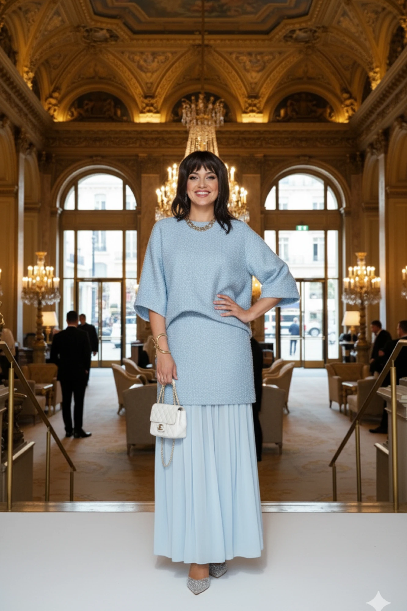 Это стильный и современный юбочный костюм, созданный для особого случая. Он состоит из трёх частей: блузы, верхней и нижней юбки. Основу ткани составляет роскошный твид голубого цвета с металлическим блеском, в который искусно вплетена деликатная люрексовая нить, придающая полотну благородное мерцание. Он не только подчеркивает достоинства фигуры, но и дарит ощущение комфорта и роскоши. Блуза (состав: 43% акрил, 32% пэ, 23% хлопок, 2% люрекс, подкладка 100% полиэстер.) свободного силуэта, выполненная из плотной, фактурной ткани с серебристым блеском. Её простой крой с широкими рукавами создаёт расслабленный силуэт. Горловина в блузе округлой формы, по переду нагрудные вытачки. Спинка без особенностей. Рукав длиной ¾, широкий, фигурной формы с застроченной складкой. Низ в блузе ассиметричный. Юбка представляет собой многослойную конструкцию: верхний слой выполнен из той же блестящей ткани, что и блуза, и имеет прямой силуэт мини-длины. Нижний слой — это длинная, струящаяся юбка-макси из полупрозрачного, лёгкого шифона серого цвета. Такое сочетание фактур и длин создаёт интересный и динамичный образ. Верхняя юбка (состав: 43% акрил, 32% пэ, 23% хлопок, 2% люрекс, подкладка 100% полиэстер.) длины мини, прямого силуэта с притачным поясом со вставкой эластичной тесьмы- резинки в бочках. В среднем шве юбки застёжка на потайную тесьму-молнию и пуговицу в поясе. Юбка на подкладке. Нижняя юбка (состав: 100% полиэстер) длины миди, со сборкой на резинку по верхнему срезу, с притачным воланом со сборкой от подреза.