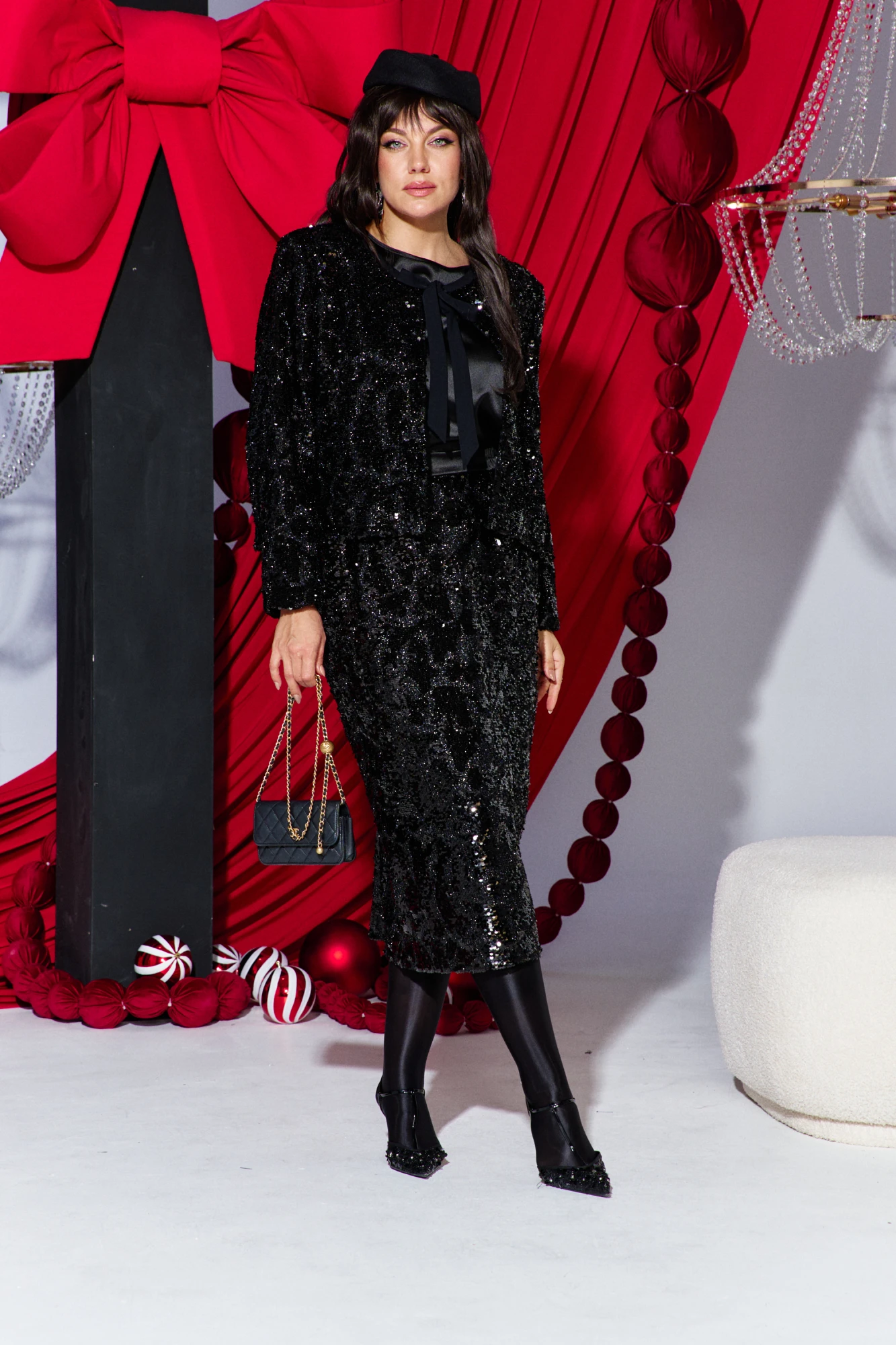 Общий образ — минимализм цвета и максимальная выразительность текстур. Материалы будто говорят на языке контраста: атласный блеск в блузе гармонично сочетается с зеркальной, перламутровой игрой пайетки. Этот комплект создает ощущение современной роскоши для вечерних выходов, деловых мероприятий и торжественных приемов, где ценят изящество без лишних деталей, спокойную уверенность и плавное движение света. Комплект женский, трёх-предметный, состоящий из жакета, блузы и юбки.Жакет (состав: 100% полиэстер, подкладка 100% полиэстер) укороченный, свободного силуэта, без застёжки, с акцентом на ровную линию плеч. Головина округлой формы с прилегающей стойкой из отделочной ткани, переходящей в декоративные ленты, завязывающиеся на бант. Спинка без особенностей. Рукав втачной, длинный. Жакет на подкладке.Блуза (состав: 97% полиэстер, 3 % спандекс) в классическом чёрном оттенке, который гармонично сочетается с насыщенным чёрным цветом комплекта. Блуза прямого силуэта с округлой формой горловины и нагрудными вытачками по полочке. Спинка без особенностей. Низ в блузе фигурной формы. Юбка (состав: 100% полиэстер, подкладка 100% полиэстер) длиной миди держит внимание за счет ткани, украшеной в густую, слегка крупную фактурную пайетку. Юбка прямого силуэта с притачным поясом со вставкой эластичной тесьмы-резинки в бочках. В среднем шве заднего полотнища юбки застёжка на молнию и пуговицу в поясе.