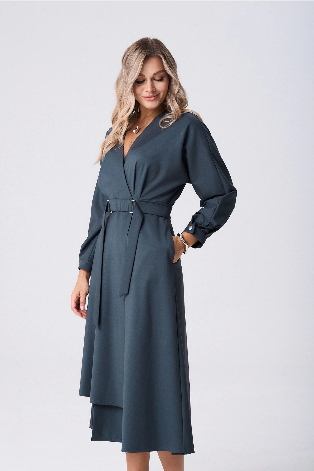 Платье женское полуприлегающего силуэта длинной миди. Платье отрезное по линии талии, на запах, с односторонними складками от пояса. Юбка платья по полочки ассиметричная, слегка расклешённая к низу. По талии приточной пояс, застегивающийся на пришивные кнопки, который дополнен отлетным поясом фиксирующийся рамками. В боковых швах обработаны карманы. Рукава цельнокроеные, по низу притачная манжета, застёгивающаяся на петлю и пуговицу.