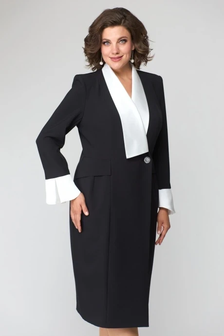 Полочка платья с вертикальными рельефами в верхней части и с отрезной боковой нижней частью с талиевой вытачкой и декоративным клапаном. Застежка двубортная, на петлю и пуговицу. Горловина V-образной формы, обработана воротником типа “апаш” из отделочной ткани. Спинка со средним швом и вертикальными рельефами. Рукав длинный, втачной, двухшовный.