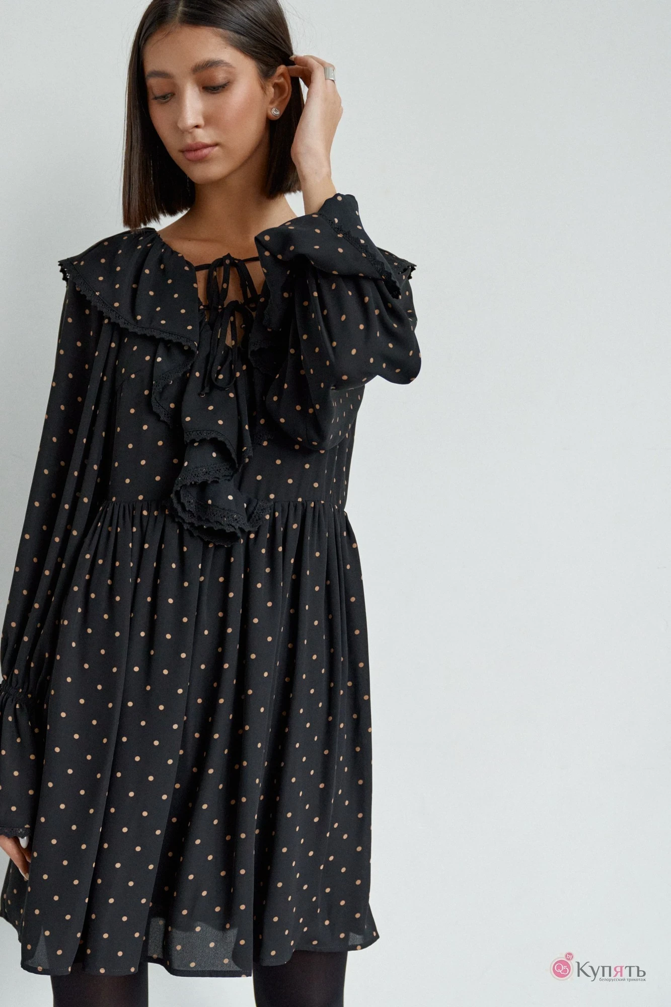 Платье женское отрезное по линии талии на подкладке. Горловина V образный вырез, в области горловины декоративные завязки. Воротник широкий украшен кружевом. Рукав втачной одношовный , по низу рукава волан на резинке украшен кружевом. Юбка в изделии свободного кроя. Длина изделия 88. Длина рукава 74.