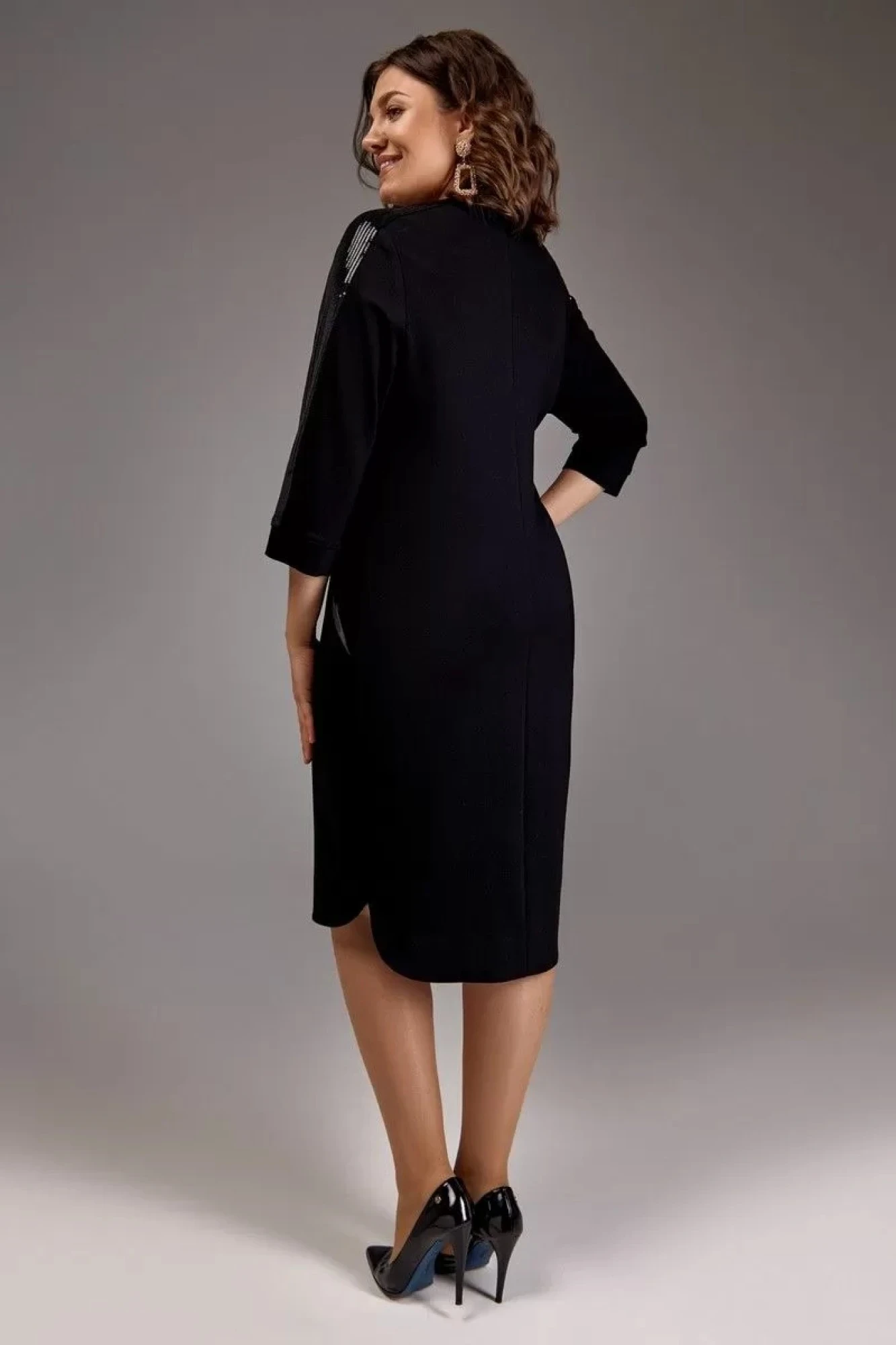 Платье из трикотажного полотна полуприлегающего силуэта. Вырез горловины круглой формы, обработан планкой. По рукаву декоративная вставка. Низ платья ассиметричный.