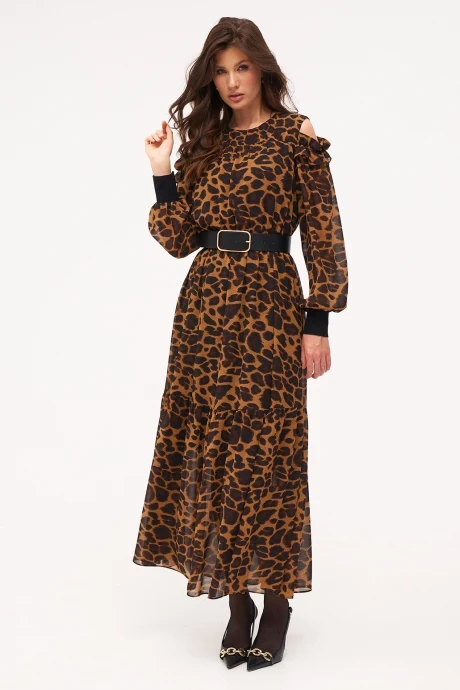Платье из струящегося шифона длиной maxi на вискозной подкладке. Длина изделия по спинке 140см. Рукав длиной 66см на трикотажной манжете 9см. Верх рукава на резинке с рюшей, по плечам небольшие вырезы. По низу изделия притачной волан на сборке. По спинке застёжка на петлю и пуговицу по горловине. Платье на резинке по талии. Комплектуется ремнём.