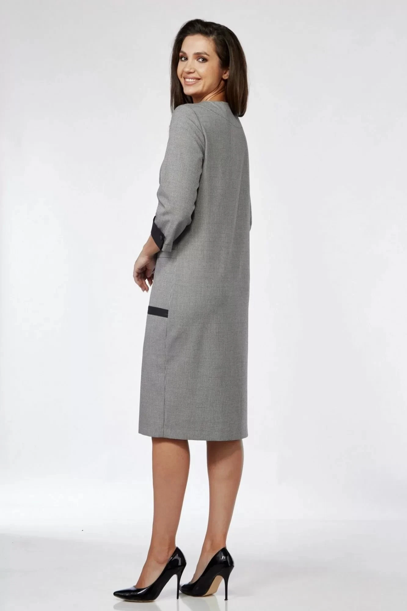Платье женское,прямого силуэта с круглым вырезом горловины на обтачке. Горловина переда отдекорирована обтачками из эко-кожи,по центру пришиты пуговицы. На уровне линии талии выполнены накладные карманы с отделкой из эко-кожи. Рукав втачной,одношовный 3/4,по низу выполнен декоративный манжет. К платью прилагается пояс из основной ткани с отделкой из эко-кожи.Длина платья по спинке 105,5см,длина рукава 46см. Реальные замеры изделия 54 ог-112см, от-111 см, об-120см, 56 ог-116см, от-115см, об-124см, 58 ог-120см, от-119см, об-128см, 60 ог-124см, от-123см, об-132см