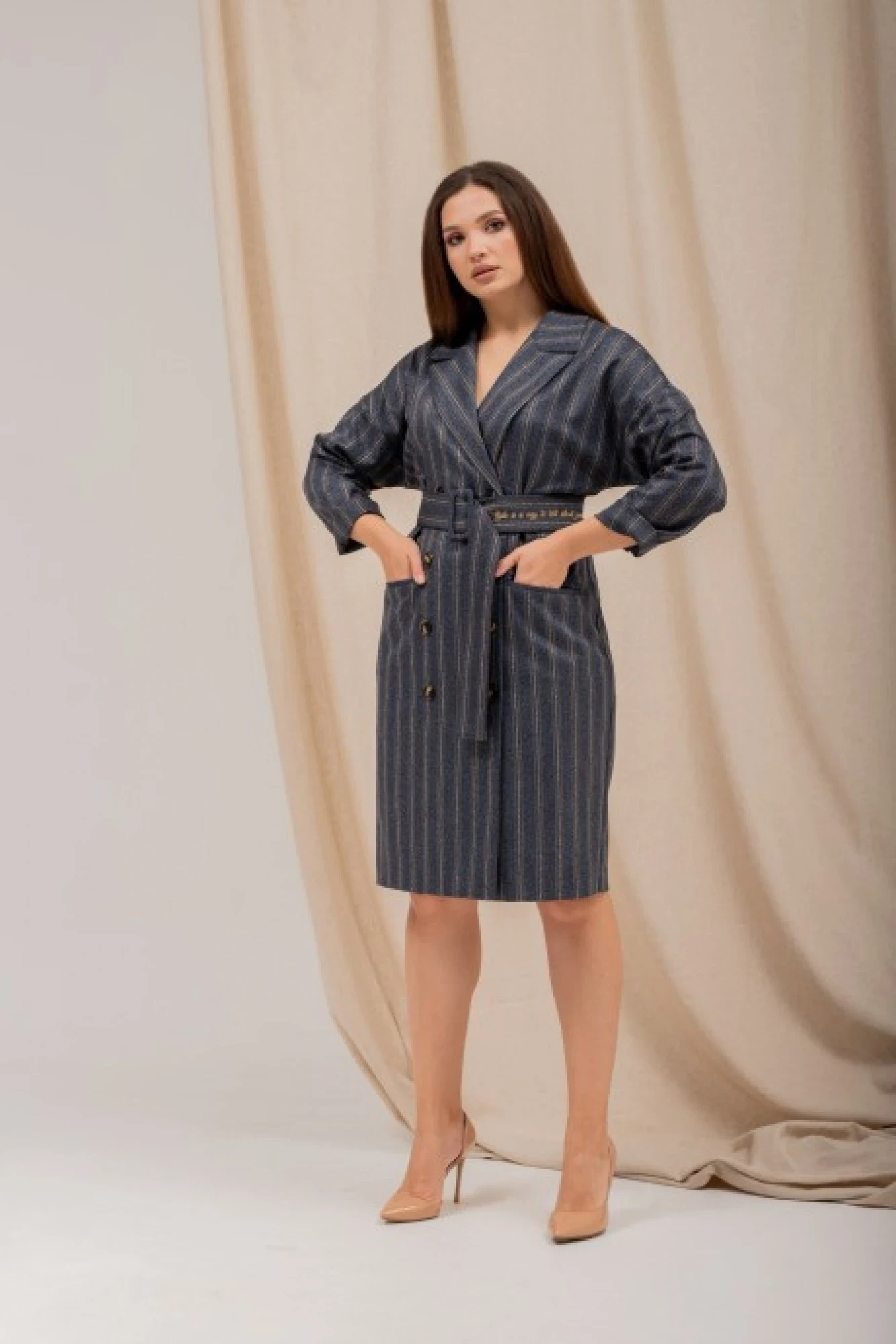 Платье женское свободного силуэта, со спущенными рукавами, выполнено из плательной ткани. По переду талевые вытачки и прорезные карманы оформлены «в рамку». Платье с двубортной застёжкой на восемь петель и пуговиц. Воротник отложной с лацканами. Рукава одно шовные втачные. Спинка с центральным швом. Платье без подкладки. Дополнением служит пояс с пряжкой который украшен вышивкой.