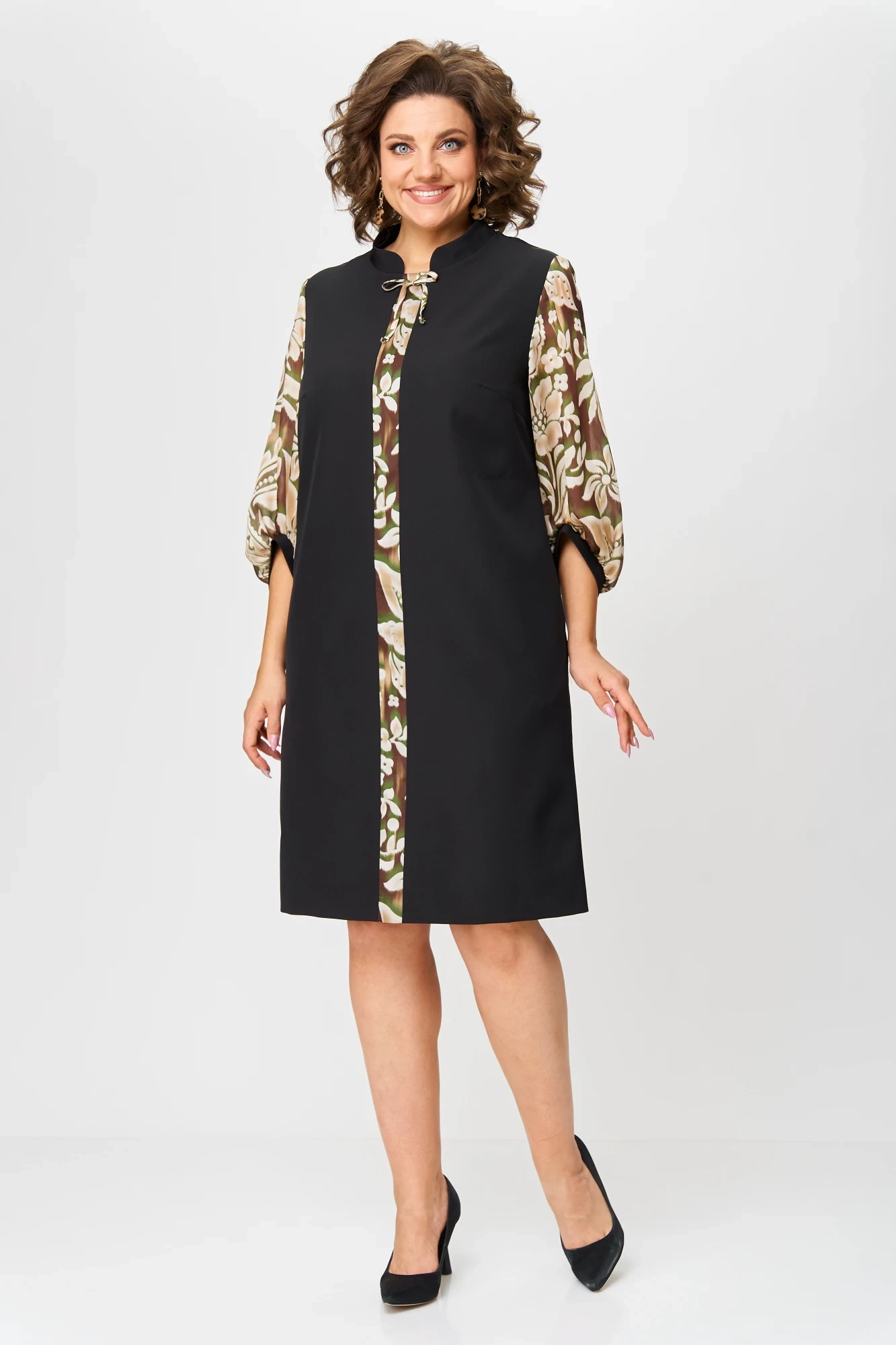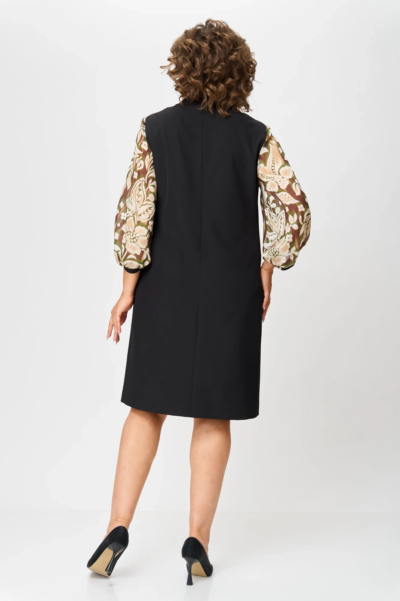 Платье женское прямого силуэта, без подкладки, тесьма-молния в среднем шве спинки. Перед с нагрудными вытачками, по центру вставка. Боковые карманы в швах. Спинка со средним швом. Воротник стойка, с закругленными концами, до вставки переда. Горловина обработана обтачкой. Рукав одношовный, втачной, со сборкой по низу, с притачной манжетой. В качестве отделки пришито украшение по центру вставки переда, продето в завязку.