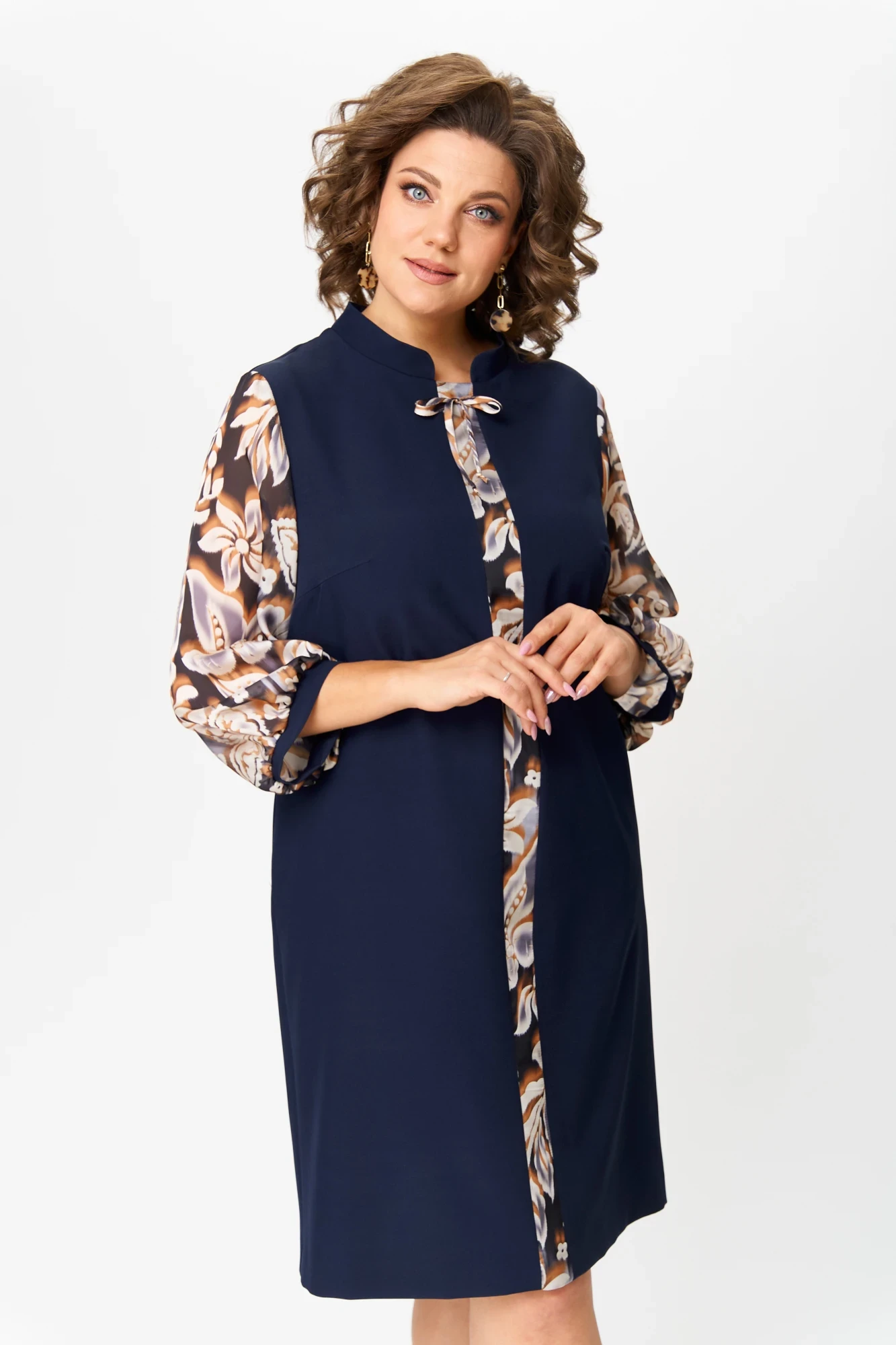 Платье женское прямого силуэта, без подкладки, тесьма-молния в среднем шве спинки. Перед с нагрудными вытачками, по центру вставка. Боковые карманы в швах. Спинка со средним швом. Воротник стойка, с закругленными концами, до вставки переда. Горловина обработана обтачкой. Рукав одношовный, втачной, со сборкой по низу, с притачной манжетой. В качестве отделки пришито украшение по центру вставки переда, продето в завязку.