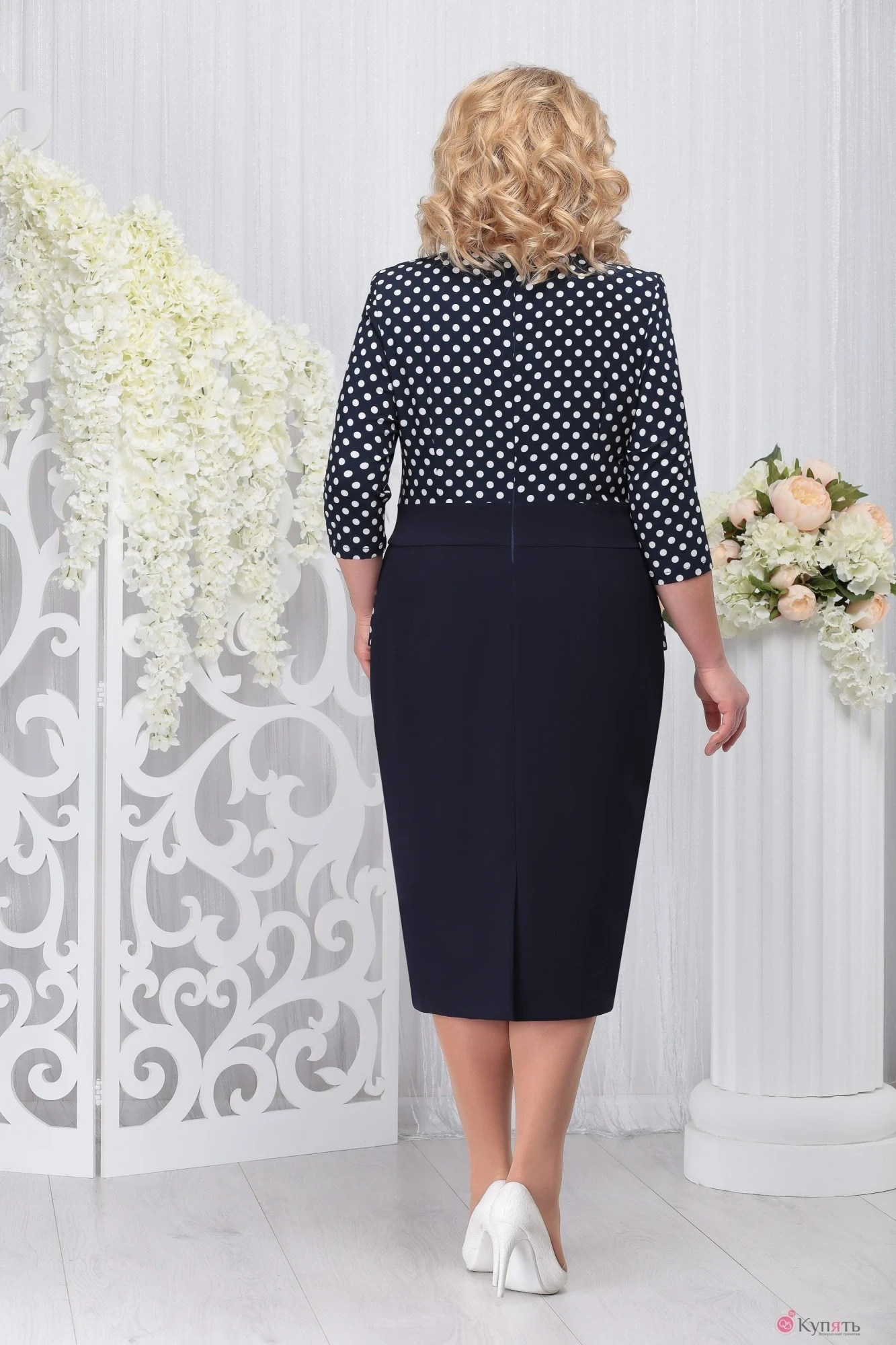 Необычное платье сочетает в себе элегантную строгость и романтичную непринужденность, поэтому будет уместно и на прогулке, и на тожественном мероприятии. Лаконичный полуприлегающий силуэт красиво подчеркивает женственные формы. Вшитый поясок делает талию стройной и грациозной. От нижней части пояса спускается широкий свободный элемент, напоминающий продолжение бузы. Верхняя часть модели декорирована асимметричными складками и аккуратной цветочной аппликацией. Ненавязчивый контраст однотонного низа и верха с узором в кружочек придает образу интересную «изюминку». Платье женское, полуприлегающего силуэта, к низу чуть зауженное, с подрезом по линии талии, со вставкой в виде пояса, на подкладке из дышащей, приятной на ощупь и достаточно эластичной ткани. Приталенное платье темного цвета в светлый мелкий горошек, дополненное подрезным поясом, подчеркивает фигуру. Длина по среднему шву спинки 107,0 см. Верхняя часть переда ассиметричная, на горловине частично зашитые складки, справа одна, слева две. В косые подрезы вставлены канты из ткани. На обтачной баске переда, на продолжении подрезов верха, частично зашиты под наклоном встречные складки. Спинка и юбка с талевыми выточками. В среднем шве обработана застёжка на потайную тесьму молнию и шлица. Горловина углублённая спереди, круглая, обтачная. Рукава втачные, одношовные, длиной 44,0 см. Изделие с плечевыми накладками. На левой части переда нашит декоративный цветок. Ширина рукава по линии плеча/ Ширина платья на уровне талии, см 54р – 40,5/100 см, 56р – 42,5/104 см, 58р – 44/108 см, 60р - 45,5/112 см, 62р – 47/116 см.