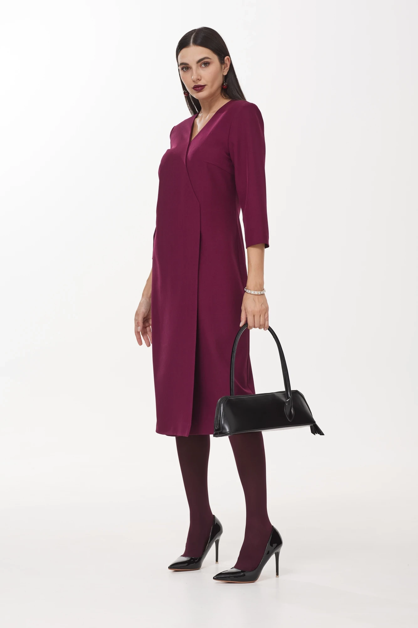 Платье полуприлегающего силуэта, выполненное из плательно-костюмной ткани, длиной миди. Перед с имитацией "платья на запах". По переду обработаны нагрудные вытачки, отлетные детали переда зафиксированы изнутри. Спинка с талиевыми вытачками и со средним швом, в который вставлена потайная молния. Рукав втачной, длиной 3/4. Горловина платья с V-образным вырезом. В комплект к платью идёт съёмный пояс из основной ткани.