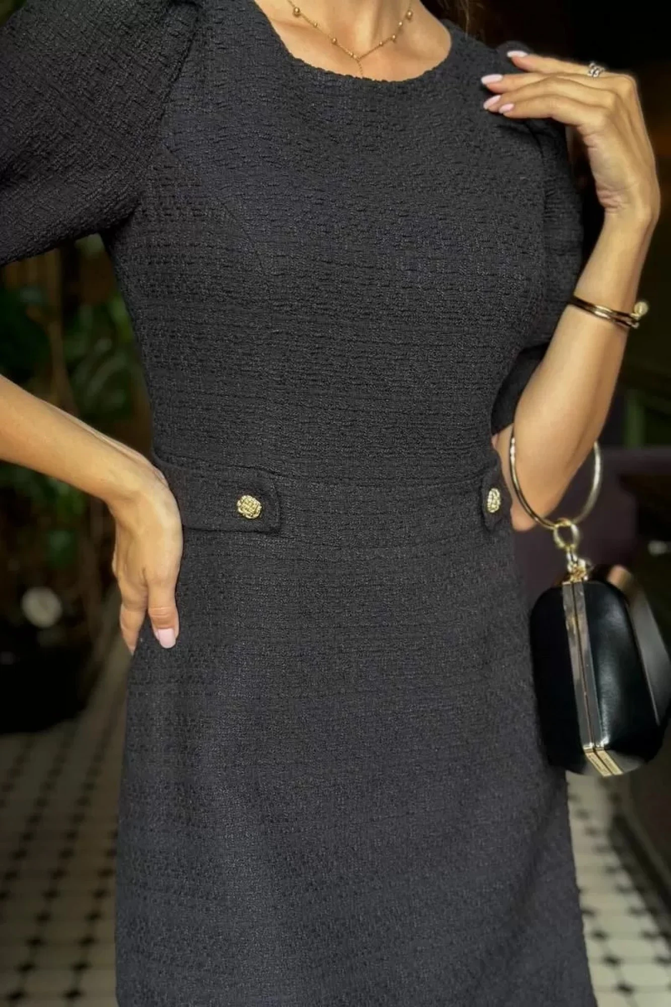 Маленькое черное платье в стиле Шанель - это не просто платье, это символ элегантности и стиля. Оно создано из мягкой ткани, которая создает утонченный образ. Платье имеет классический крой, что делает его универсальным и подходящим для любого случая. Черный цвет придает ему изысканность и элегантность, а отделка в виде пуговиц добавляет женственности и очарования. Это платье идеально подходит для тех, кто ценит качество и стиль. Платье женское силуэта песочные часы из ткани типа «Сhanel» на трикотажной подкладке, отрезное по линии талии с втачным поясом, длиной до колена.