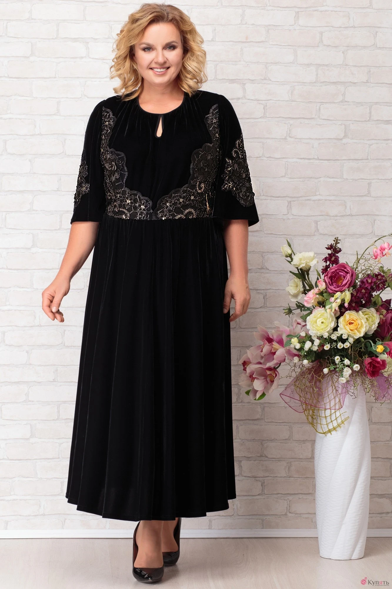 Платье женское из бархата на трикотажной основе; полуприлегающего силуэта, расширенное к низу. Изделие без подкладки, с плечевыми накладками, отрезное по линии талии, с застежкой на потайную тесьму-«молнию» в левом боковом шве. Лиф переда с талиевыми вытачками, со сборкой и вырезом-«каплей» по горловине; украшен по бокам ажурным кружевом с фестонным краем. Спинка лифа двойная, с наложением кружева и со средним швом. Юбка переда и спинки присборенная по верхнему краю, со швом по центру. Длина по спинке 129 см. Рукава втачные, одношовные, расширенные к низу, со сборкой по головке рукава; декорированы настрочными фрагментами кружева. Длина рукава 41 см. Горловина круглой формы; по переду обработана окантовкой, по спинке – обтачкой.