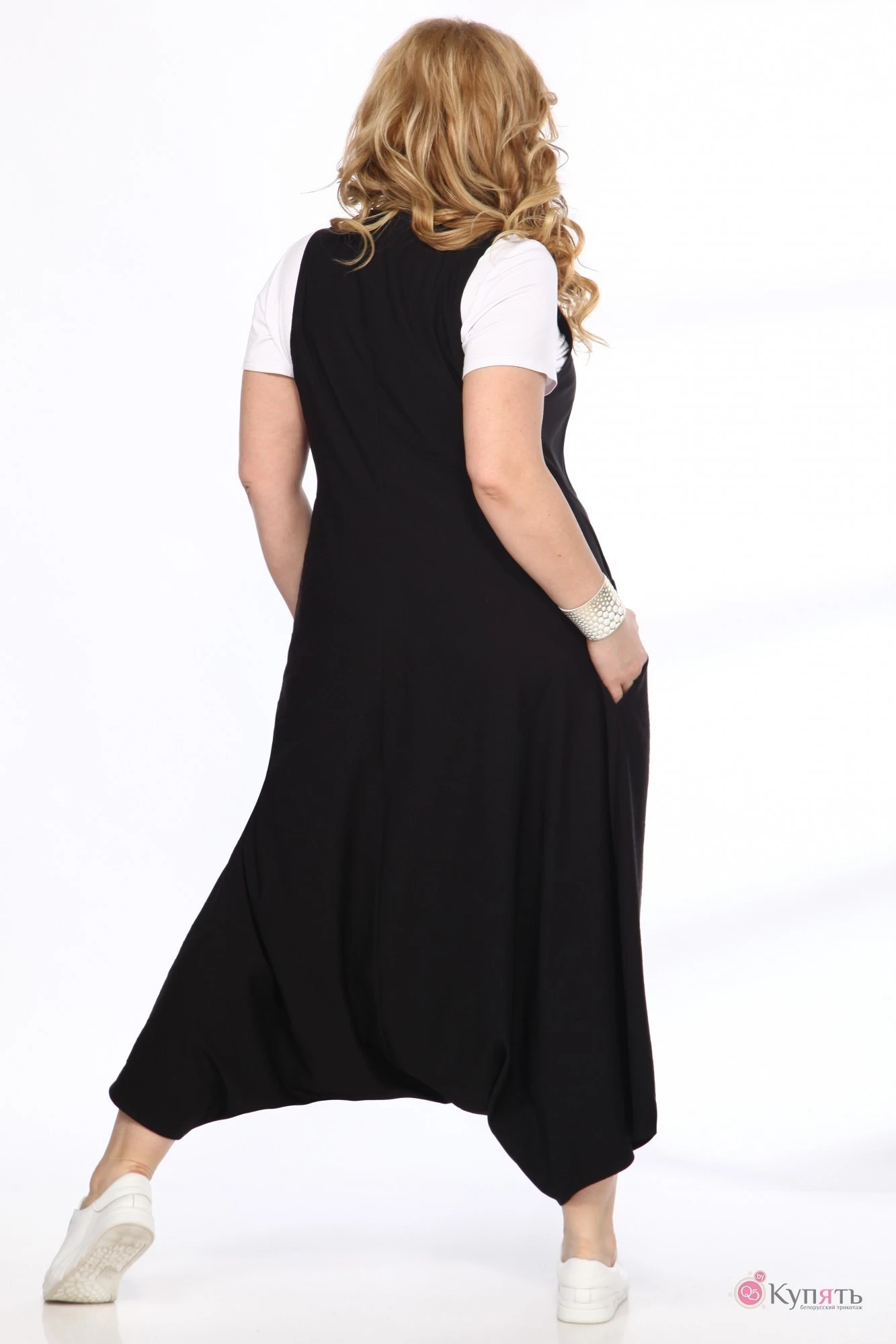 Женский сарафан-трансформер в стиле бохо. Низ сарафана выполнен таким образом, что застегнув его сарафан становится комбинезоном. По переду и спинке чуть ниже линии талии декорированые подрезы. В боковых швах по переду расположены карманы-хулиганы. Спинка сарафана со средним швом , в котором расположенапотайная молния. Длина по спинке 135, длина по переду 120