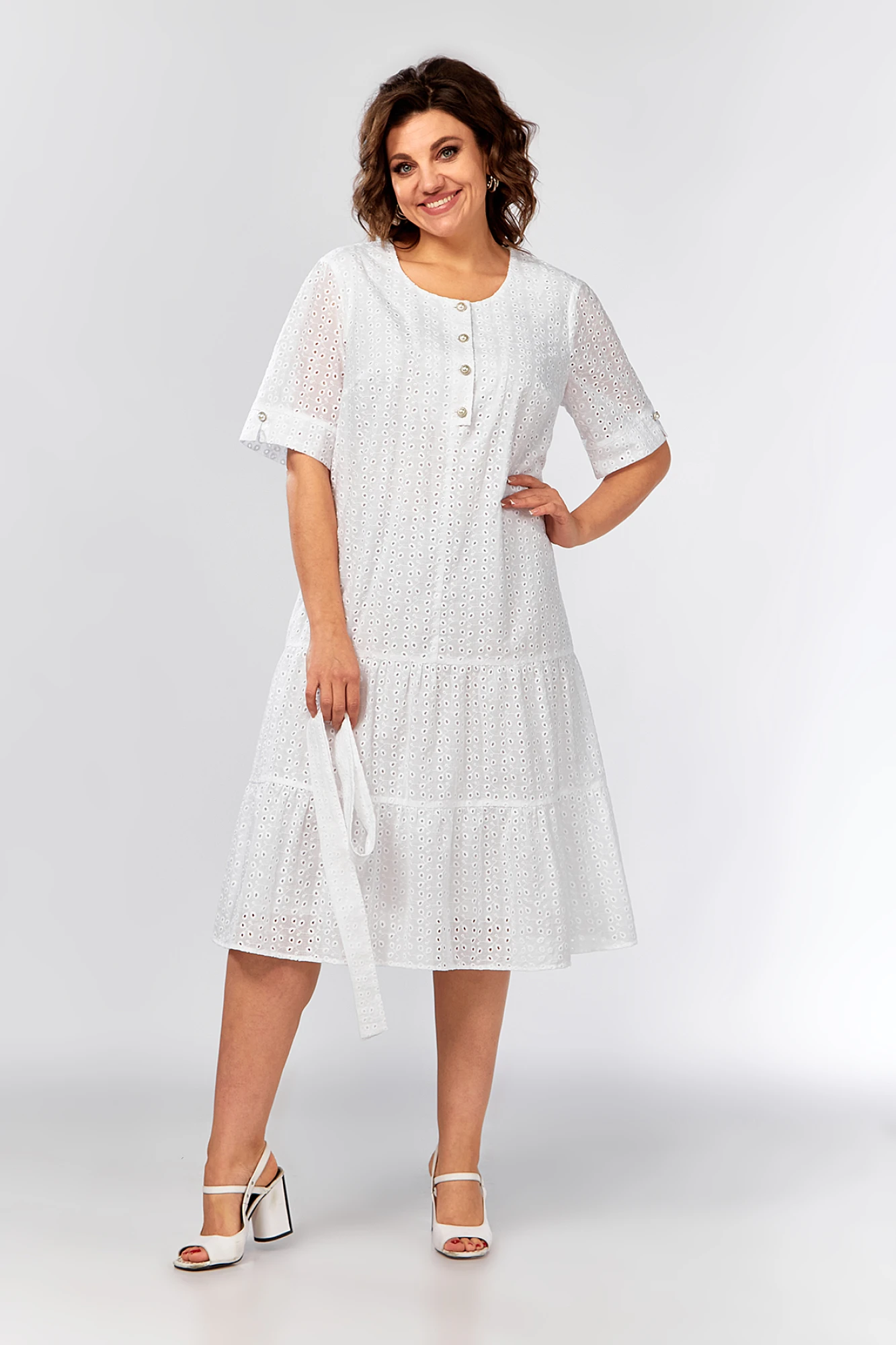 Нарядное однотонное платье из шитья станет красивым дополнением элегантного, женственного образа. Необычная модель трапециевидного силуэта сделает Вашу фигуру грациозной. Платье выполнено из натуральной хлопчатобумажной ткани, которая подарит комфорт в процессе носки. Универсальное и практичное платье в два яруса воланов по низу, собранных на сборку, длиной ниже колена. На переде платья есть нагрудные вытачки, а также цельнокроеная планка, которая декорирована пуговицами и петлями. Вырез горловины круглый. Рукав втачной, короткий. По нижней части рукава есть манжет, который декорирован пуговицей. В модели есть съёмный пояс. Платье на подкладке из натуральной хлопчатобумажной ткани. Подойдёт для посещения деловых мероприятий и торжественных событий, таких как свадьба, выпускной, день рождения.