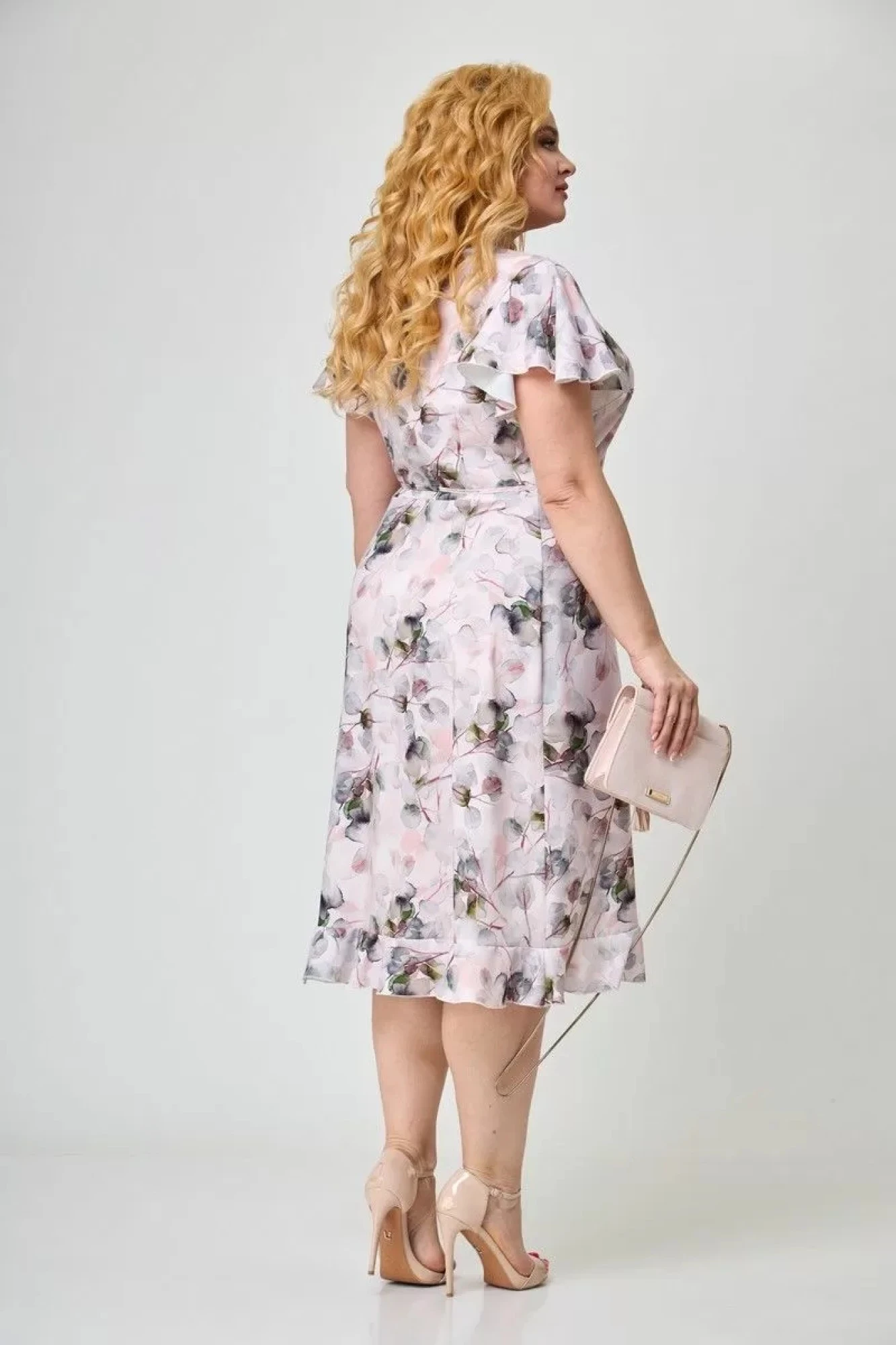 Полуприлегающий силуэт с функциональной застежкой на запах и завязывающимся деталями по линии талии. Рукава-воланы короткие. Вырез горловины V-образный.