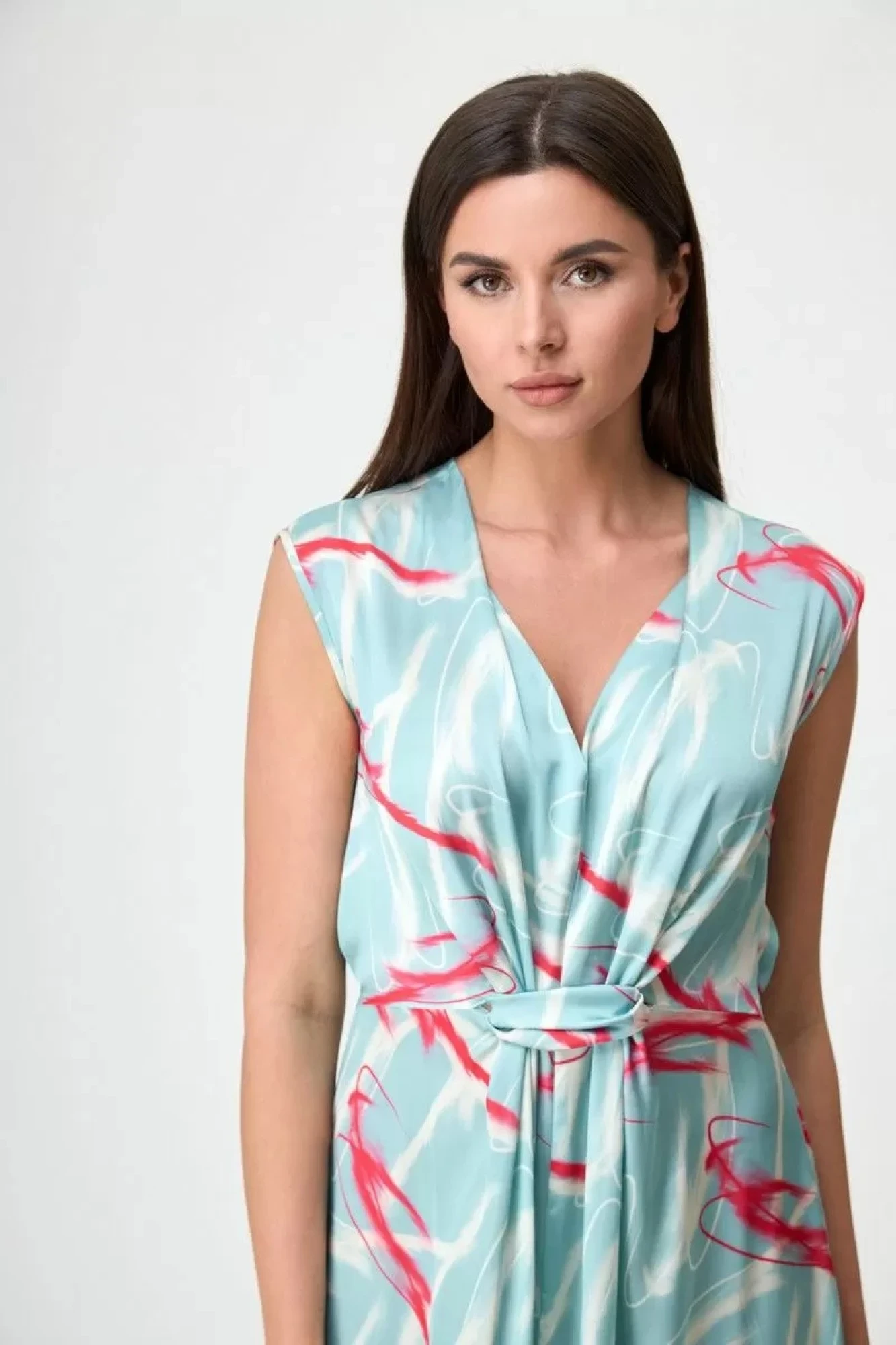 Платье женское прямого силуэта, чуть расширенное к низу, длина миди. По переду V-образный вырез горловины, по линии талии декоративный узел подчеркивающий вашу грудь. Для удобства передвижения разрез в среднем шве по переду. Линия талии спинки на резинке. Дизайнерский принт, актуальная расцветка, лёгкость, женственной и комфорт. Вся необходимая информация о производителе указана на этикетке.