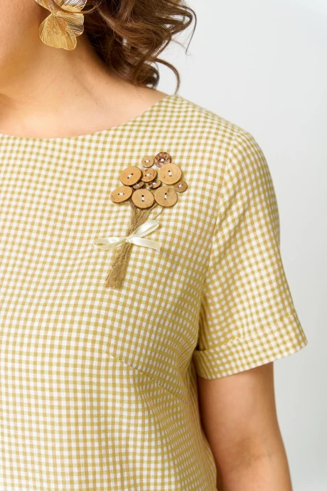 Платье свободного кроя. Вырез округлой формы. Верх платья с завышенной талией: по переду - нагрудные вытачки и декоративное украшение, по спинке - центральный шов с застежкой на молнию. Низ платья — свободная летящая юбка со сборкой из-под верхней части платья, которая обеспечит комфорт и свободу движений. В боковых швах юбки функциональные карманы. Рукав втачной короткий, понизу - притачная манжета."