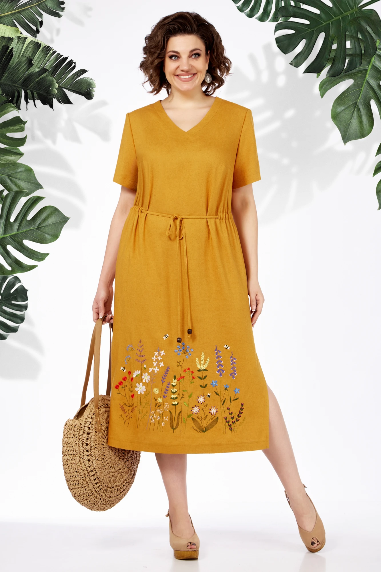 Платье женское, удлиненное, прямого силуэта, с кулисами по бокам в области талии, выполнено из плательно-костюмной ткани.Перед с нагрудными вытачками и вышивкой по низу.Спинка со средним швом.Боковые швы заканчиваются разрезами. Рукава втачные одношовные короткие.